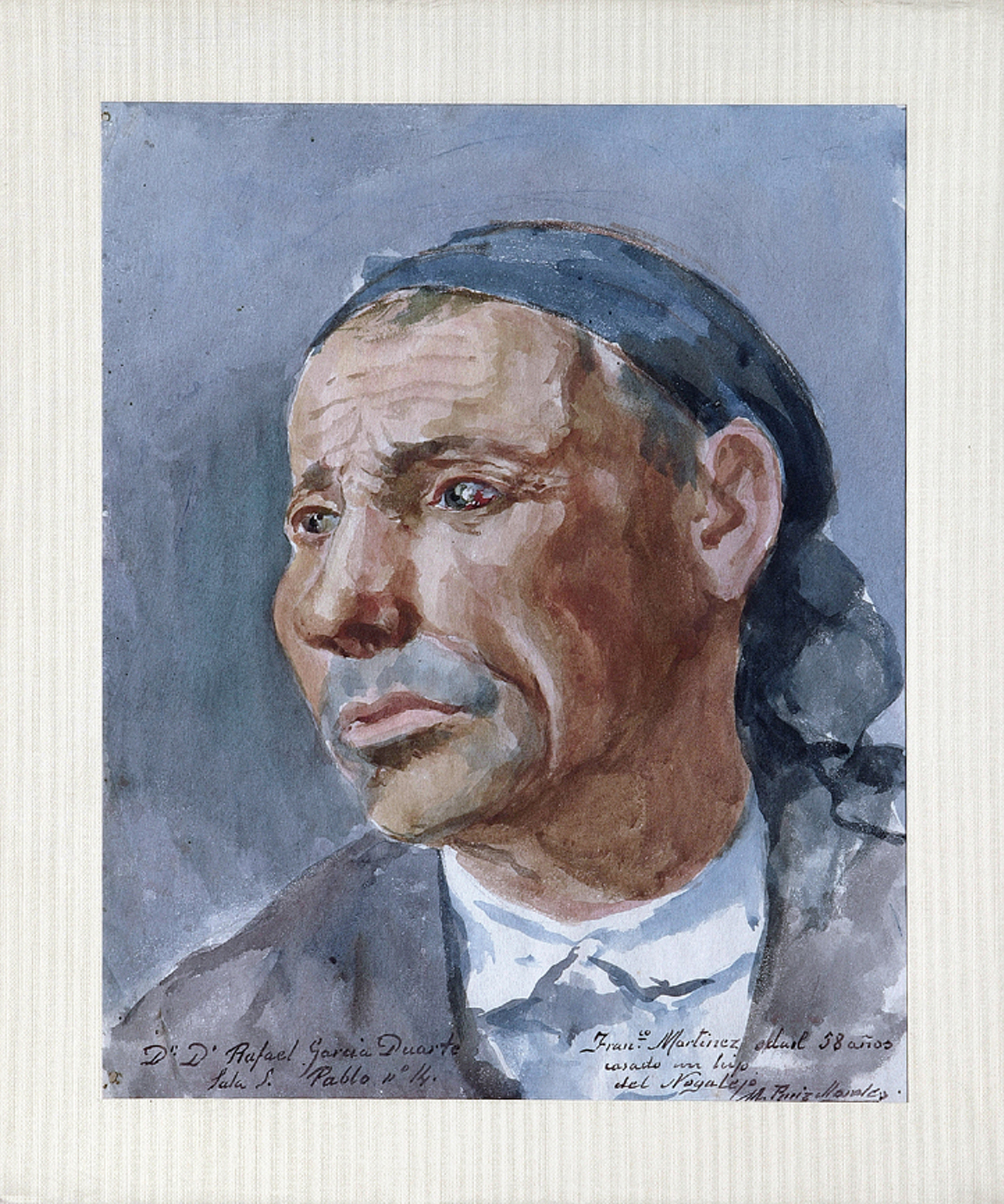 Acuarela anatómica que representa a Francisco Martínez Olluel. Lejos de ser el retrato de un personaje público de relevancia en su época o un familiar del artista, el retratado es un paciente y el fin último de esta acuarela no es representar a Francisco, sino su enfermedad, un derrame de córnea en el ojo izquierdo. Una anotación al margen permite identificar a Rafael García-Duarte González, también granadino, como el médico que lo trató.