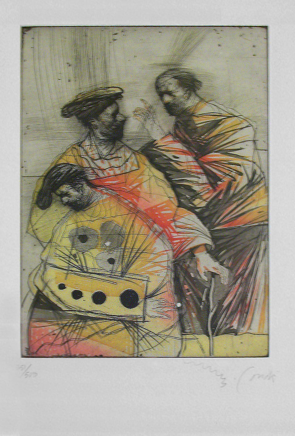 Miguel Condé (Pennsylvania, Estados Unidos, 1939). Pintor, dibujante y grabador, afincado en España. En 1948 se establecerá en Nueva York donde estudiará dibujo anatómico con el profesor Steven Rogers Peck. Obtendrá una beca en 1963 que le hará viajar a París y trabajar en el taller de grabado de Stanley William Hayter. Ejercerá de profesor de dibujo en la Universidad de Iowa, EE.UU, participará en el taller itinerante de grabado de Instituto Smithsoniano de Barcelona. En 1969 se establecerá en España, Sitges, y en 1974 realizará su primera exposición en el país. Su obra se encuentra dentro de la figuración, pero con un toque muy personal, ya que sobresale la fantasía y lo simbólico, lienzos cargados de un sentido poético. Considerado uno de los más importantes maestros contemporáneos en el mundo del grabado.