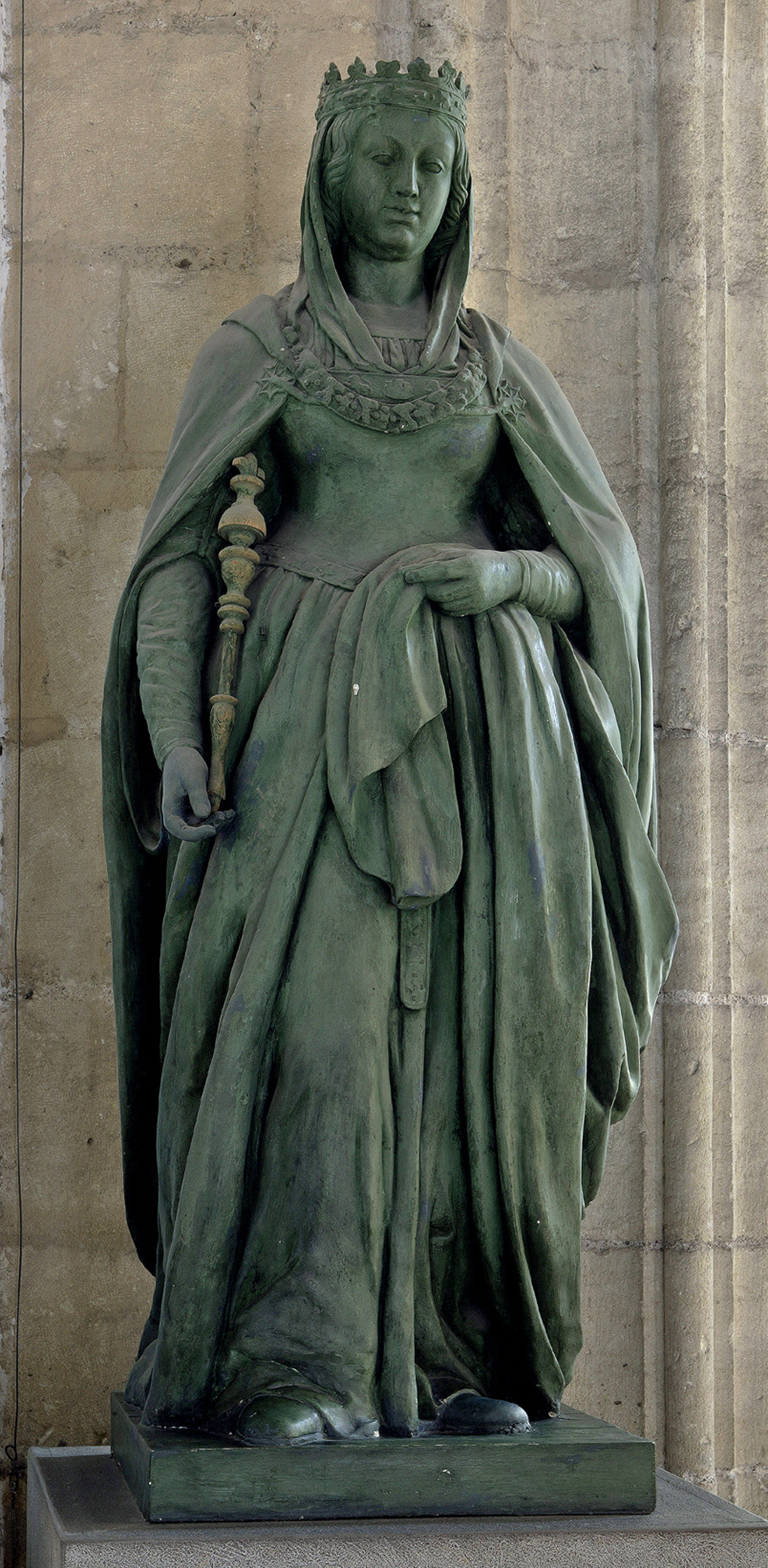 Se trata de la copia de la escultura realizada por los hermanos Miguel y Antonio Marín Torres, junto a la de Fernando el Católico, para la Exposición Provincial de Bellas Artes, Industria y Agricultura organizada con motivo de la visita de Isabel II a Granada en 1862 y a la cual se concedió medalla de oro. Probablemente estas réplicas de las originales en bronce presidieron el Patio de los Arrayanes con ocasión del baile de la gala ofrecido a la reina. Las piezas debieron quedar bajo la custodia de la Diputación Provincial, organizadora de la muestra, presidiendo el Salón de Plenos y pasando en fecha indeterminada al Hospital Real, fundación de los monarcas, en cuyo almacén fueron halladas hacia 1980 y colocadas en su actual emplazamiento. Una información oral atribuye al escultor Domingo Sánchez Mesa una primera restauración tras su hallazgo. Fue restaurada por parte del Taller de Restauración de la Facultad de Bellas Artes de Granada en 1997.