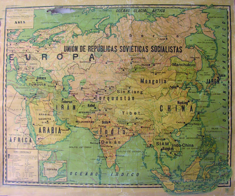 "MAPA ESCOLAR-F PALUZÍE MIR / IMPRESO Y EDITADO / POR / Imprenta Elzeviriana Y Librería Camí, S.A. / Calle Joaquín Costa, 64-/ Calle Joaquín Costa, 64-Barcelona / Asia / 1936" (inserta en la obra).