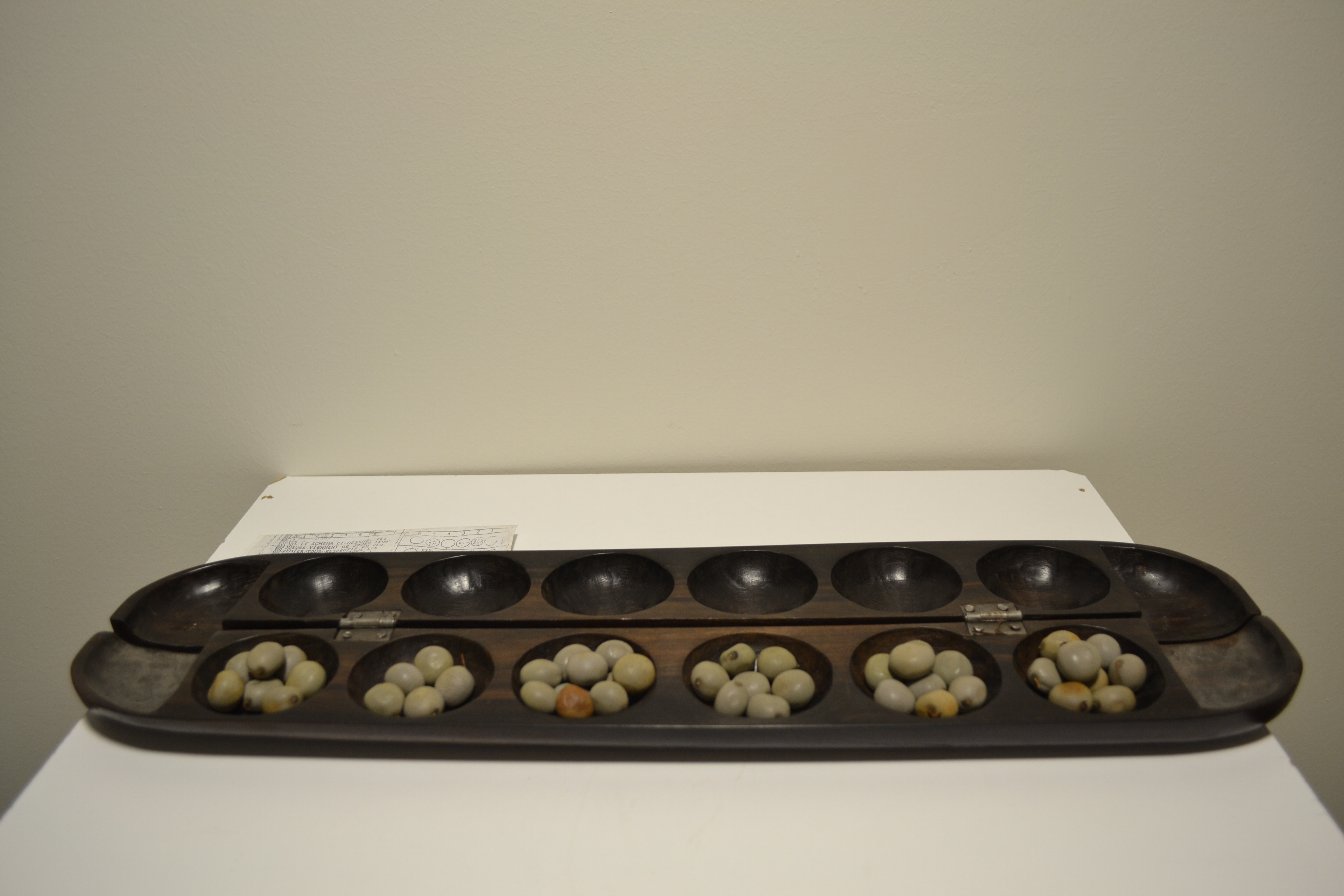 Caja de ébano tallada en dos piezas ensambladas con bisagras. En la parte externa se decora con un paisaje tallado que representa unas montañas tras las que aparece el sol y cuatro construcciones que remiten a la arquitectura vernacular africana de planta circular, cuyo único vano es una pequeña puerta y con tejado inclinado realizado con material vegetal. En el interior de la caja se han realizado ocho oquedades en ambos lados, seis de ellas circulares y dos rectangulares en cada uno de los extremos de ambos lados. Dentro de las oquedades se guardan cuarenta y ocho semillas.
