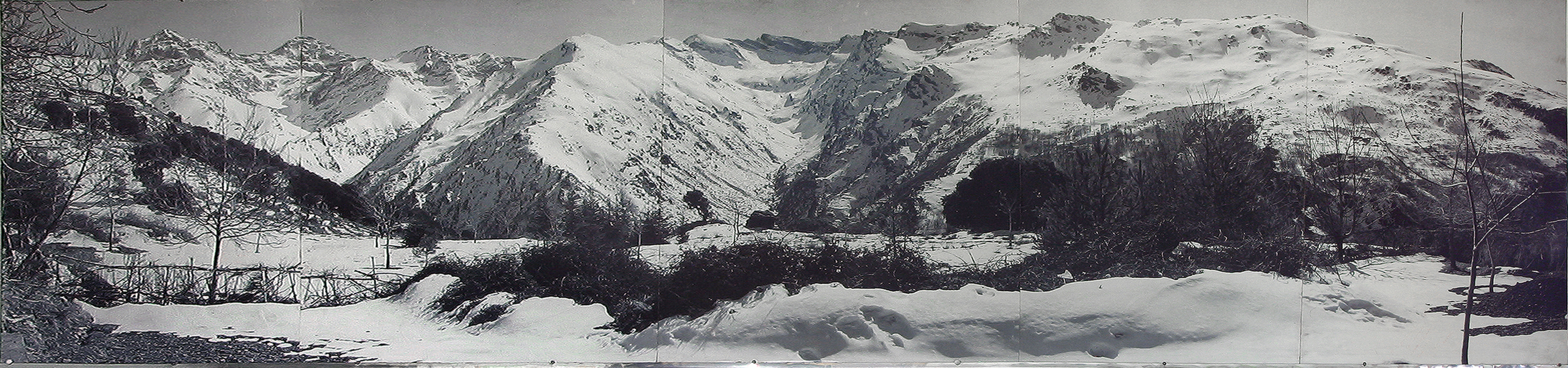 Fotomontaje en blanco y negro del paisaje de Sierra Nevada realizado a través de cinco fotografías en plano general unidas, que forman una composición en gran plano general. En ella se pueden visualizar varias montañas que forman un paisaje nevado, encuadrándose la composición con árboles en los laterales. En el centro de esta destacan más árboles y vegetación, la cual consigue contrarrestar de algún modo el color blanco del paisaje. La composición de la fotografía es, por tanto, abierta ya que el punto de fuga no se organiza en torno a un motivo central.