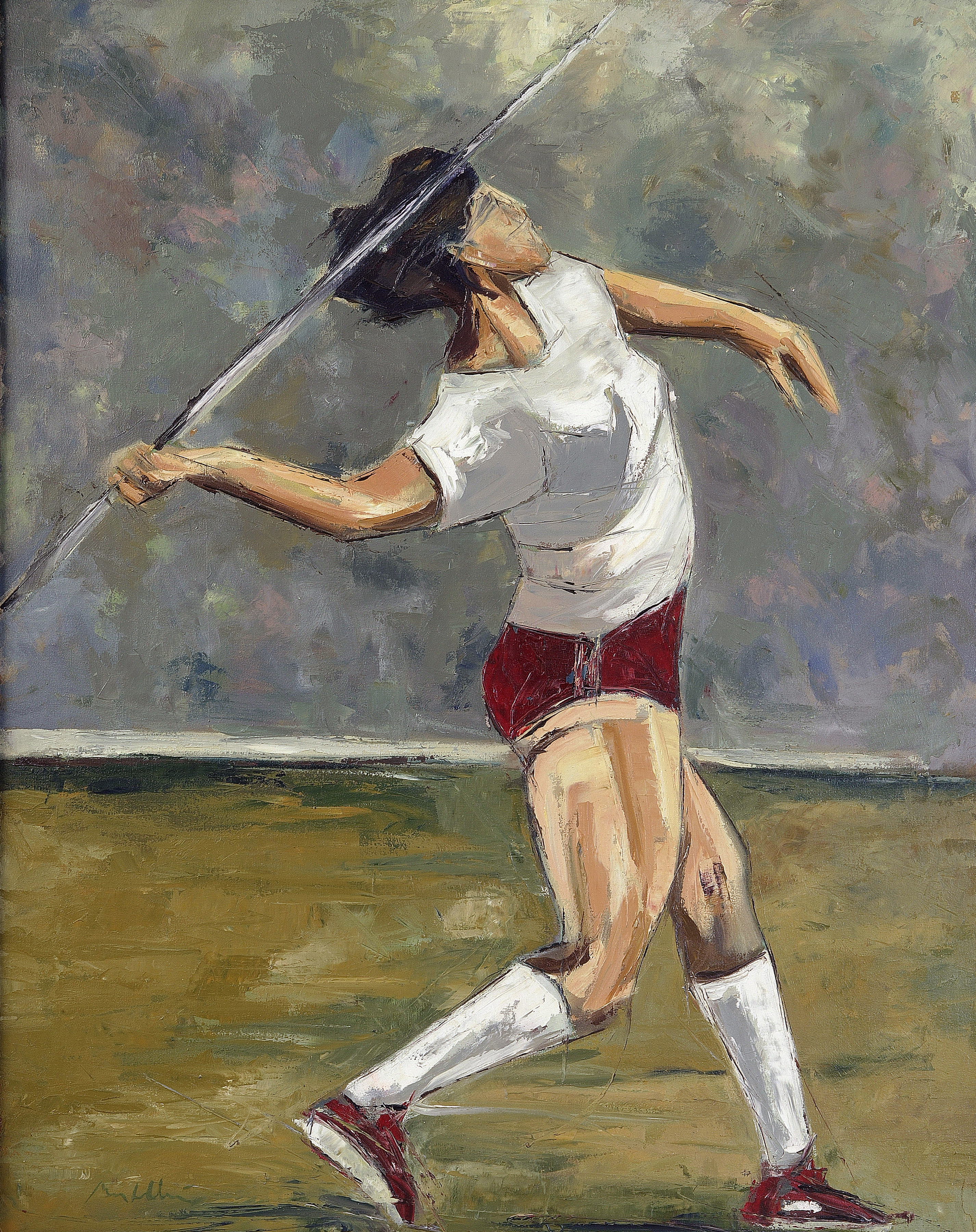 Figura femenina de rasgos abocetados, representada en medio perfil, con la pierna izquierda adelantada haciendo de apoyo y la derecha imprimiendo tensión e impulso al movimiento que, con el brazo derecho lanzará la pértiga. La silueta de la joven se perfila mediante el uso del dibujo, marcado con líneas negras, mientras que su corpulencia se expresa haciendo uso de manchas de color obtenidas con la aplicación de largas y espesas pinceladas que, además de aportar cromatismo, modulan las luces y las sombras acentuando la musculatura femenina.