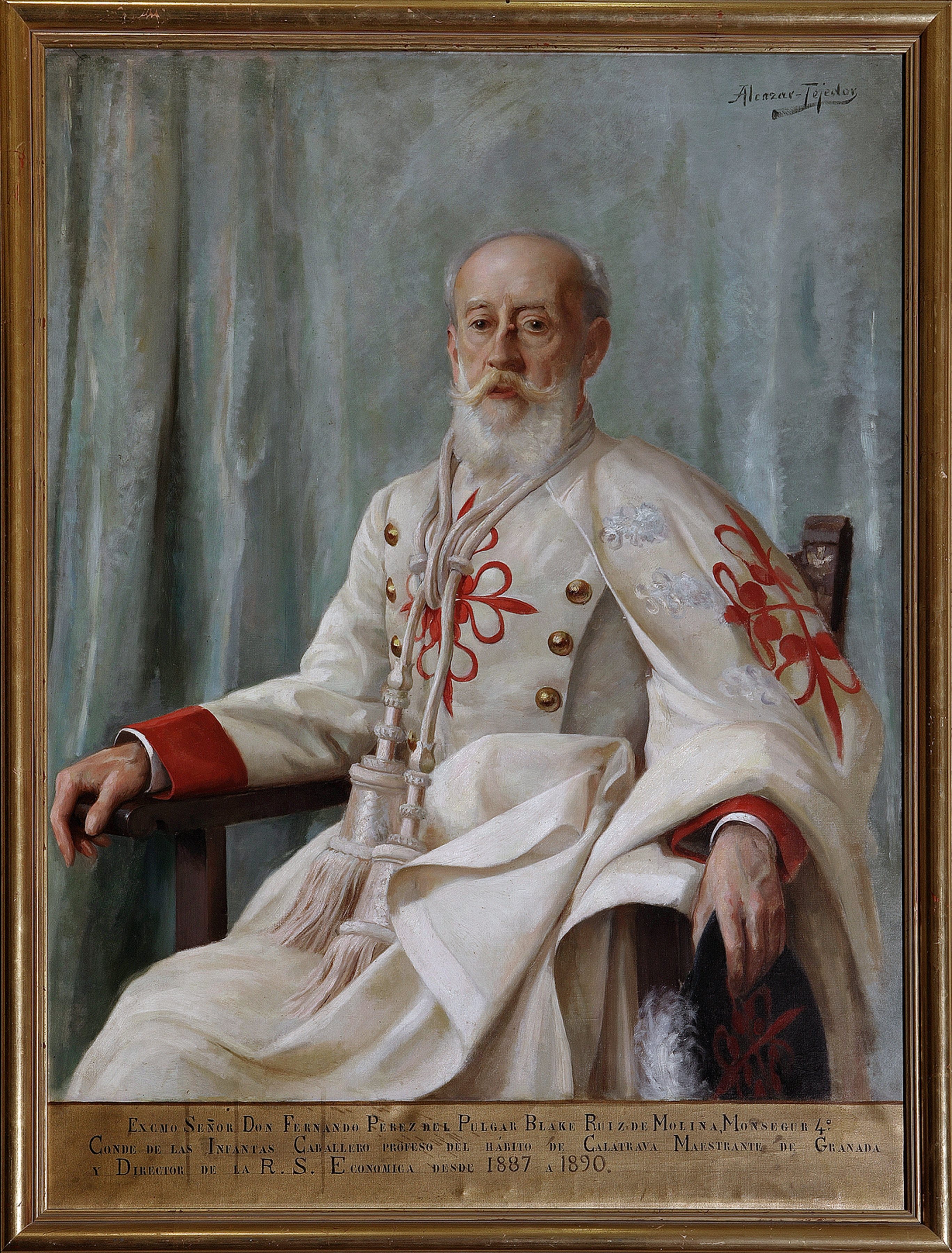 El cuadro está firmado en el ángulo superior derecho, "Alcázar Tejedor", y con una cartela en el margen inferior en la que se lee: "EXCMO. SEÑOR DON FERNANDO PEREZ DEL PULGAR BLAKERUIZ DE MOLINA, MONSEGUR 4º / CONDE DE LAS INFANTAS CABALLERO PROFESO DEL HABITO DE CALATRAVA MAESTRANTE DE GRANADA / Y DIRECTOR DE LA R.S. ECONOMICA DESDE 1887 A 1890".