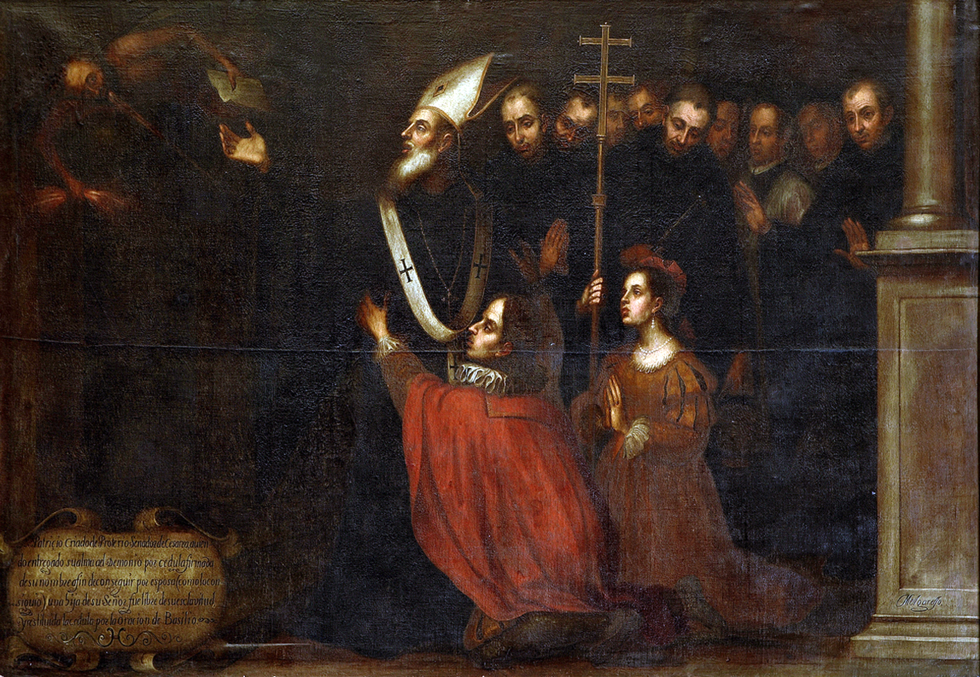 García Melgarejo ilustra el pasaje que Santiago de la Vorágine cuenta en "La Leyenda Dorada" de como Heradio (aquí Proterio) tenía intención de consagrar a Dios su única hija. Patricio, su criado, se enamoró de la joven. El matrimonio no era posible dadas las diferencias sociales entre ambos, por que el siervo invocó al diablo, firmando una cédula por la que renegaba de Cristo y de su fe a cambio de la dama. De este modo, consiguió su propósito y pronto advirtió la esposa como no era cristiano, confesándole arrepentido su artimaña. Ambos acudieron a San Basilio, quien intercedió por Patricio, recuperando en un descuido del diablo la cédula que firmó el renegado.