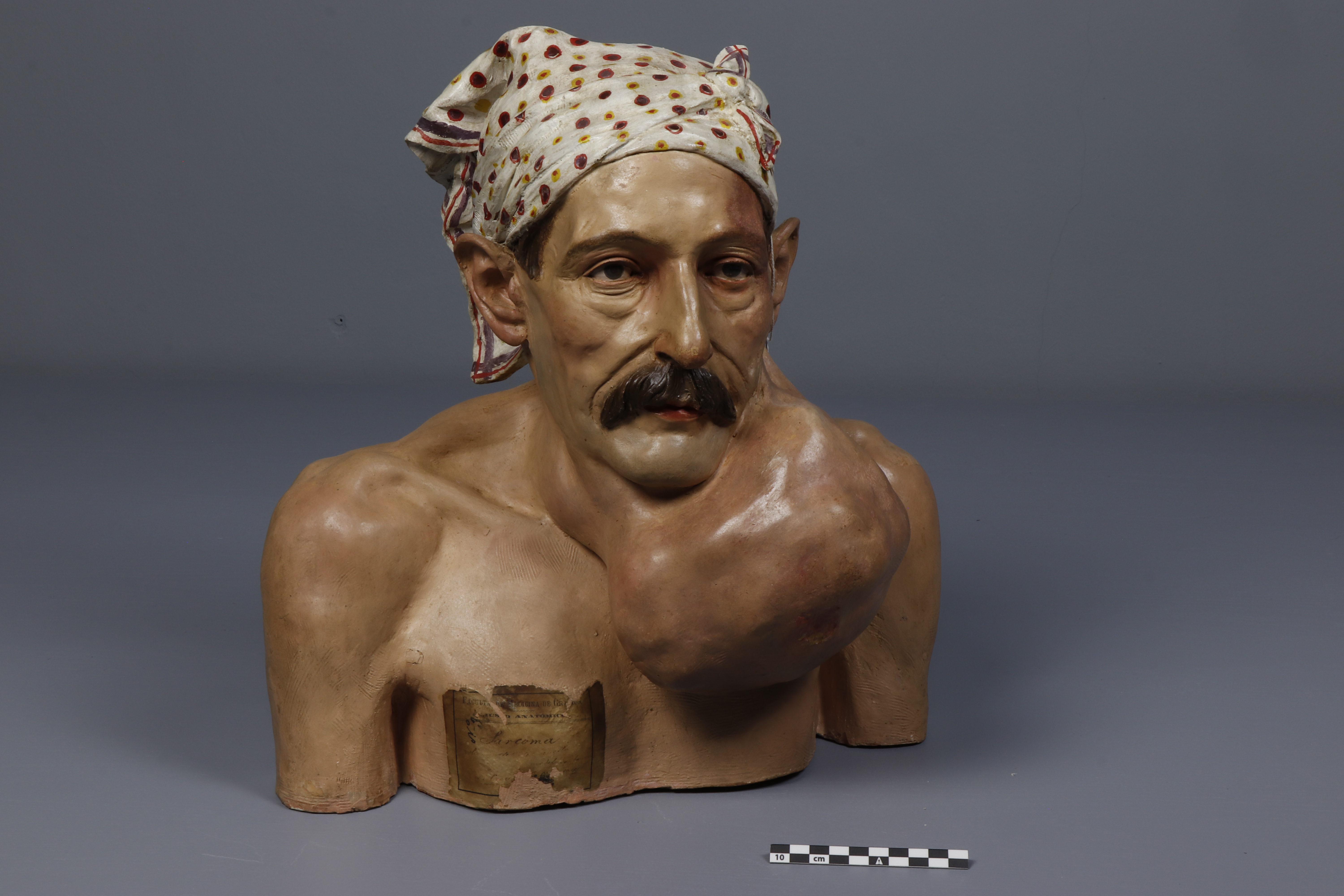 Busto masculino de barro en posición frontal y pañuelo de lunares en la cabeza. Presenta una gran tumoración ulcerada en región antero-lateral, compatible con un sarcoma de desarrollo muy avanzado. Presenta el etiquetado original del Museo Anatómico en el que consta el diagnóstico, el médico tratante (Dr. Creus), la numeración original (n.º 37) y el autor de la escultura (Morales).