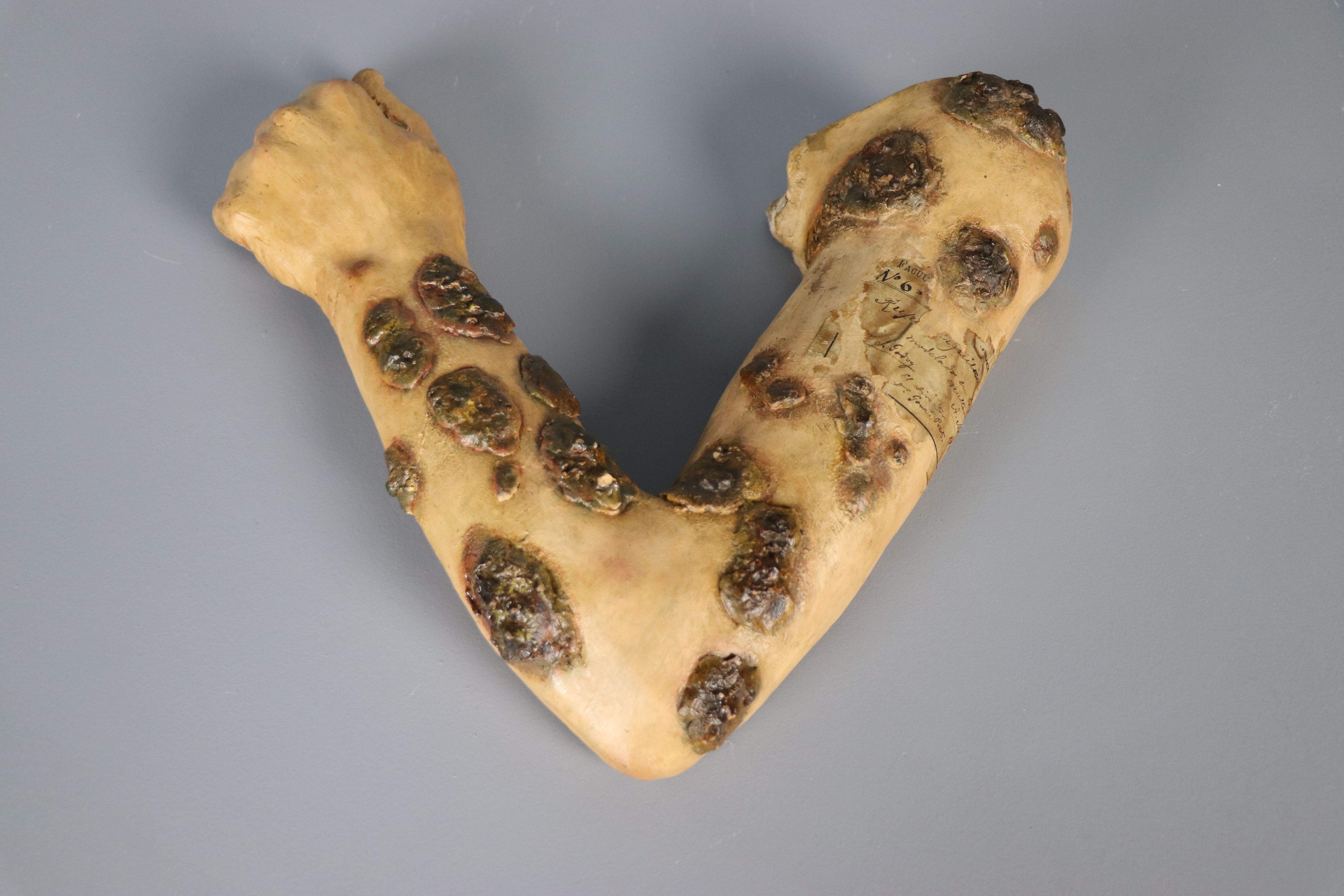 Modelo en barro de brazo y antebrazo izquierdos con deformaciones ulcerosas recubiertas de costras adherentes de contorno irregular y aspecto necrótico y distribuidas de forma homogénea. Presenta adherido el etiquetado original  del Museo Anatómico en el que consta el diagnóstico, el posible médico tratante (J. Godoy) la numeración (serie 7), el director del Museo Anatómico de la facultad (D. Gonz. Prats), el autor de la obra (A.Marín) y el año de su realización (1888)