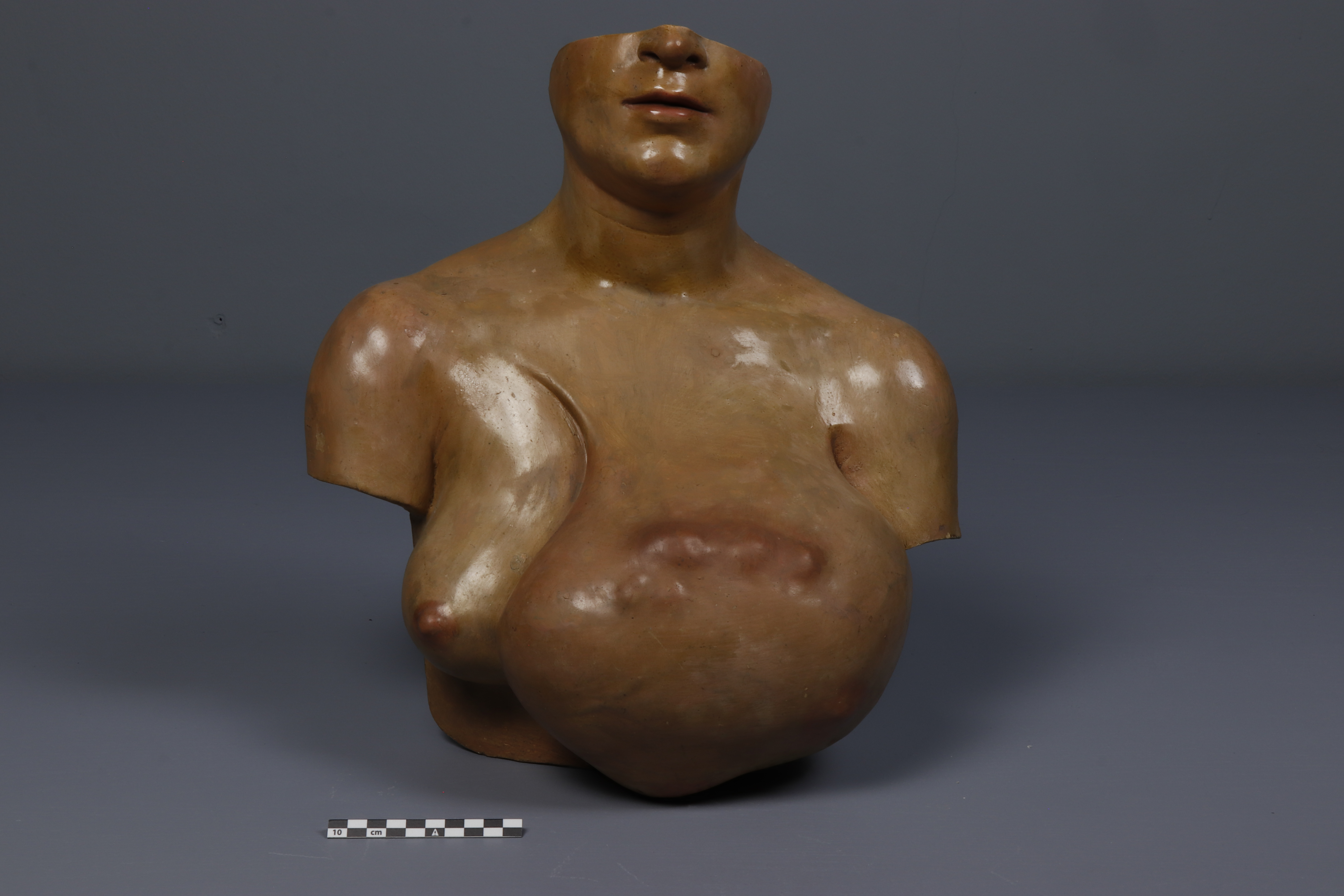 Modelo en barro de busto femenino en posición frontal con gran tumoración en la mama izquierda descolgada y desplazada contralateralmente. En su superficie se aprecian nódulos secundarios de tamaño variable y de coloración marrón-rojiza. No presenta etiqueta.