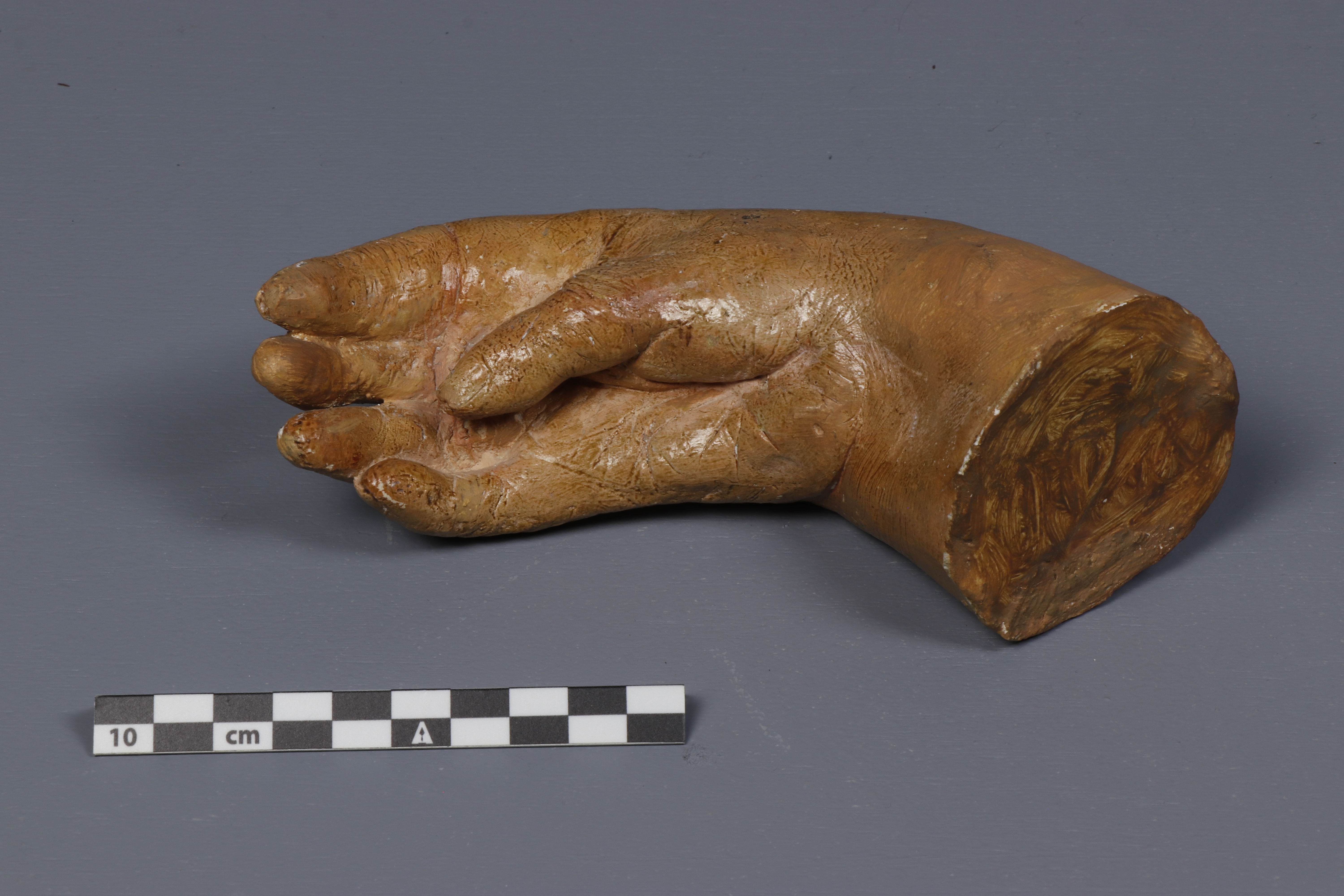 Modelo en barro de mano derecha atrófica, con flexión de los dedos. No presenta etiqueta.