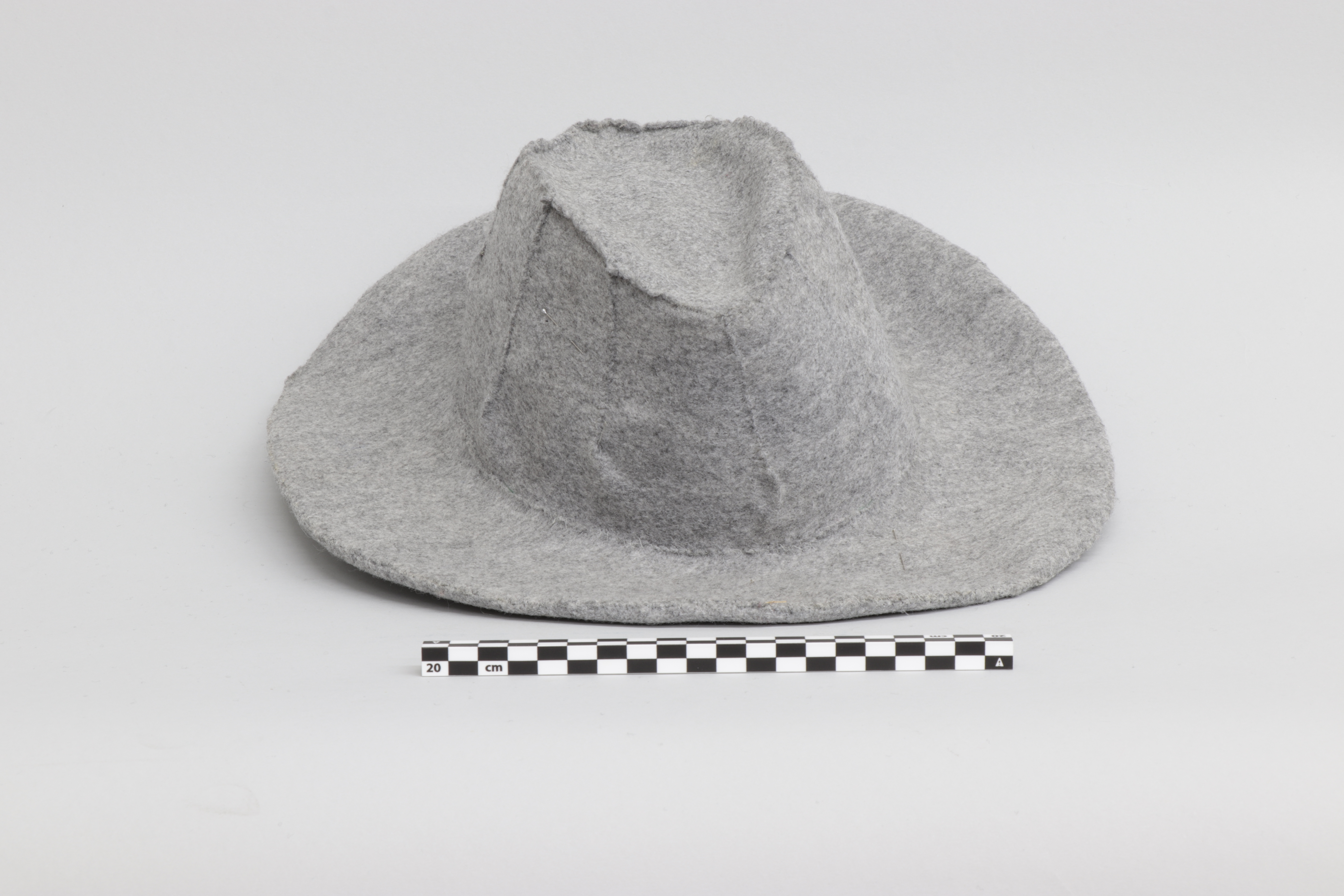 Sombrero de caña forrado de fieltro gris, una pieza tridimensional que se encuadra en un estilo objetual en donde prima la simplicidad del objeto cotidiano engalanado por la tela que lo cubre, la cual nos evoca al pasado y sus recuerdos.
