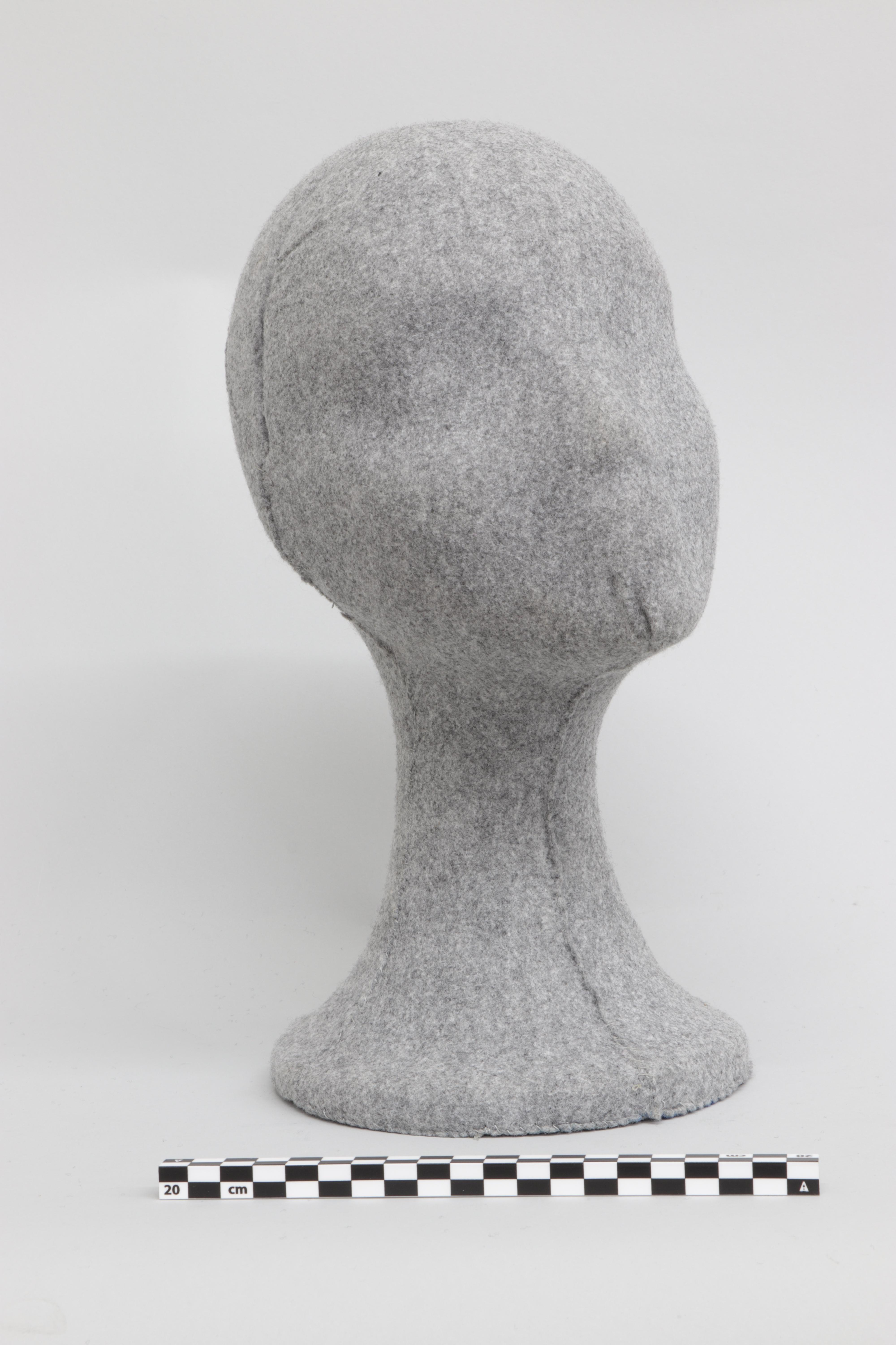 Cabeza de maniquí forrada textil en paño gris. El color del entelado evoca el recuerdo del objeto cotidiano utilizado en la vida profesional del propio artista. El gris, como color neutro adherido al maniquí, despersonifica el objeto y lo desposee de cualquier capacidad expresiva, convirtiéndolo en una pieza más de un escenario reconocible en cualquier lugar y vinculado a cualquier momento histórico.