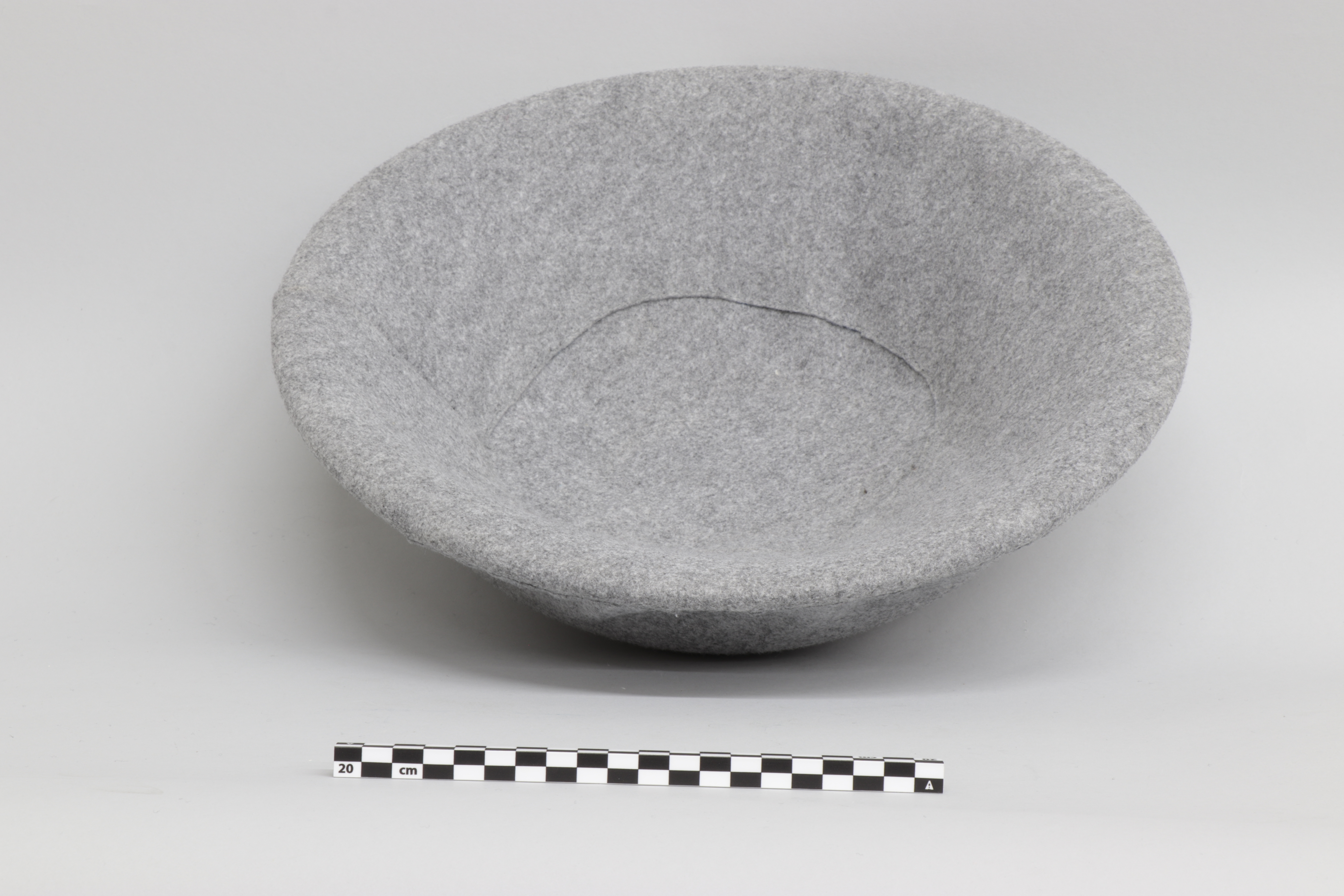 Recipiente denominado comúnmente cuenco o fuente honda, el cual presenta una forma semiesférica y sin asas de manera que podría haber sido utilizado como ensaladera con anterioridad a su transformación en pieza artística. Se encuentra revestido de fieltro gris lo que ha hecho posible el cambio de un uso cotidiano a un aspecto artístico.
