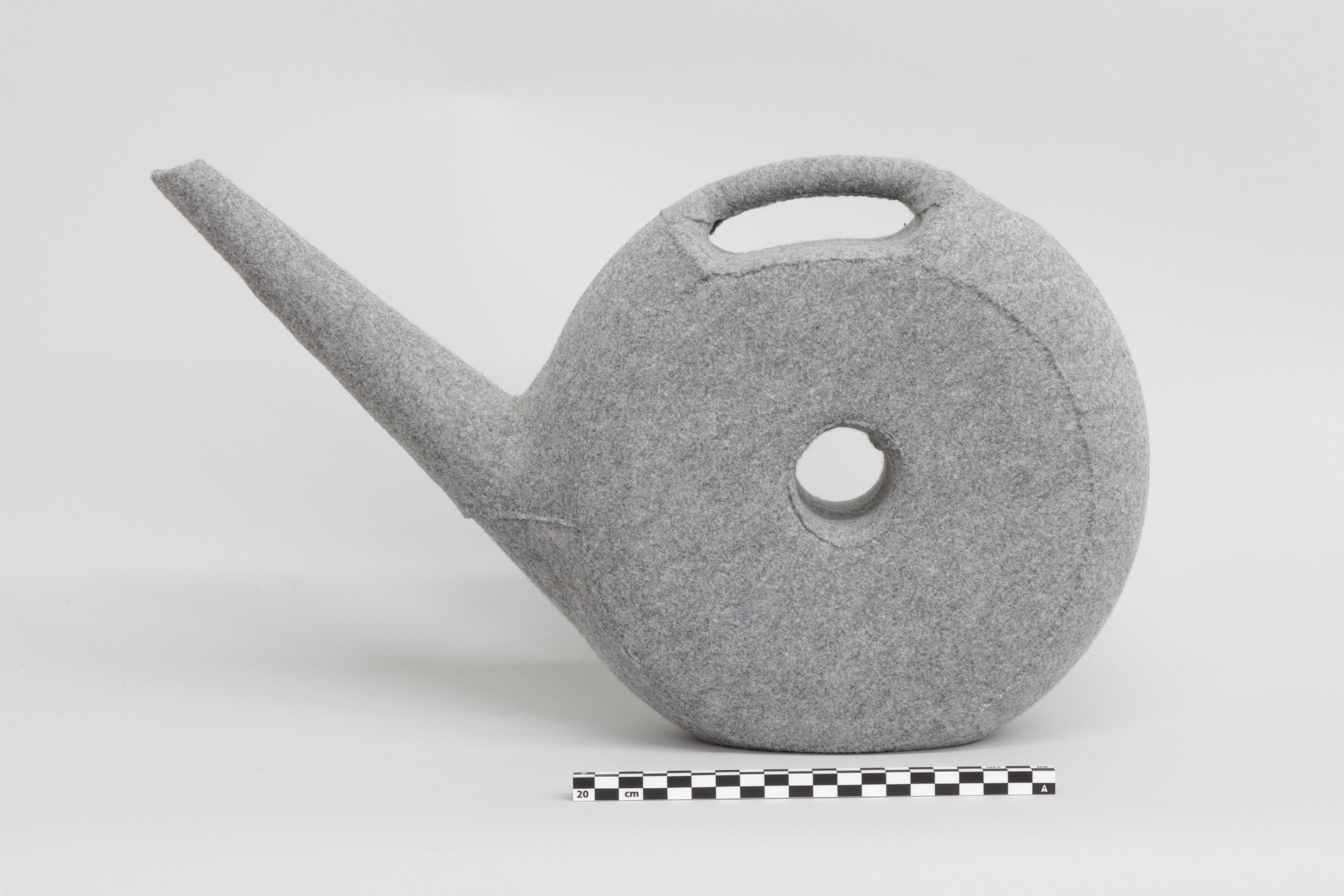 Esta pieza es un recipiente portátil que puede ser llenado de agua para regar las plantas. Concretamente es del tipo que tiene un tubo con un solo agujero por el que sale el líquido. Es de aspecto redondo con un asa pequeña en la parte superior de la esfera y un orificio en la parte central. Se presenta con un revestimiento textil en fieltro, lo cual le aporta la transformación de objeto cotidiano a pieza artística.