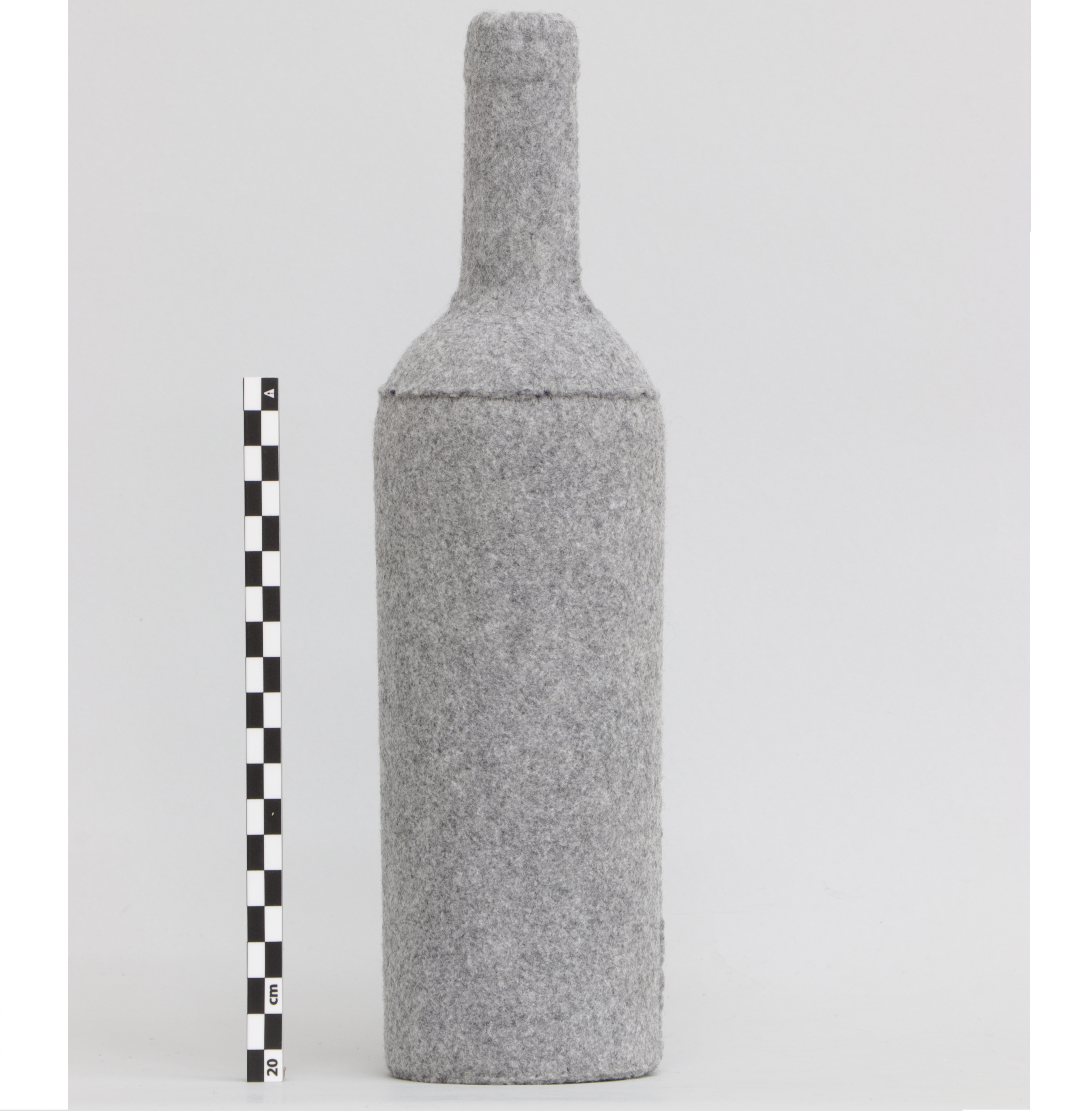 Esta pieza es un recipiente de cristal de uso cotidiano que puede contener todo tipo de líquidos. De forma cilíndrica, una base de apoyo el doble de ancha que su boca de cuello alto y estrecho. Después de su transformación por el artista en obra de arte conceptual luce un revestimiento textil de fieltro gris.