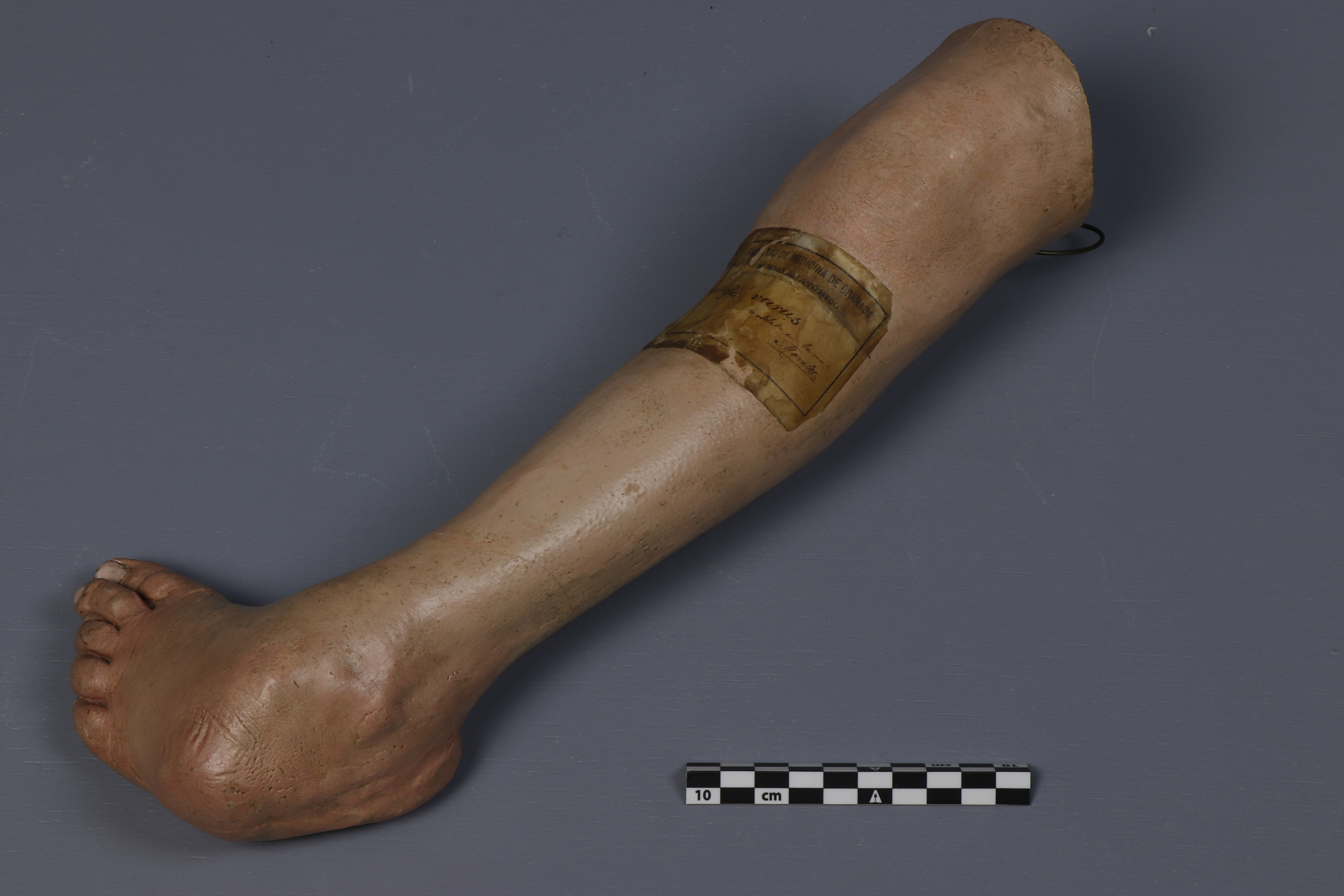 Molde en barro de pierna y pie izquierdo con gran desviación en varo y deformación acusada a nivel tarsal del pie. Presenta etiquetado identificativo del Museo Anatómico con diagnóstico y numeración originales (serie I, nº.12) y autor (Morales)