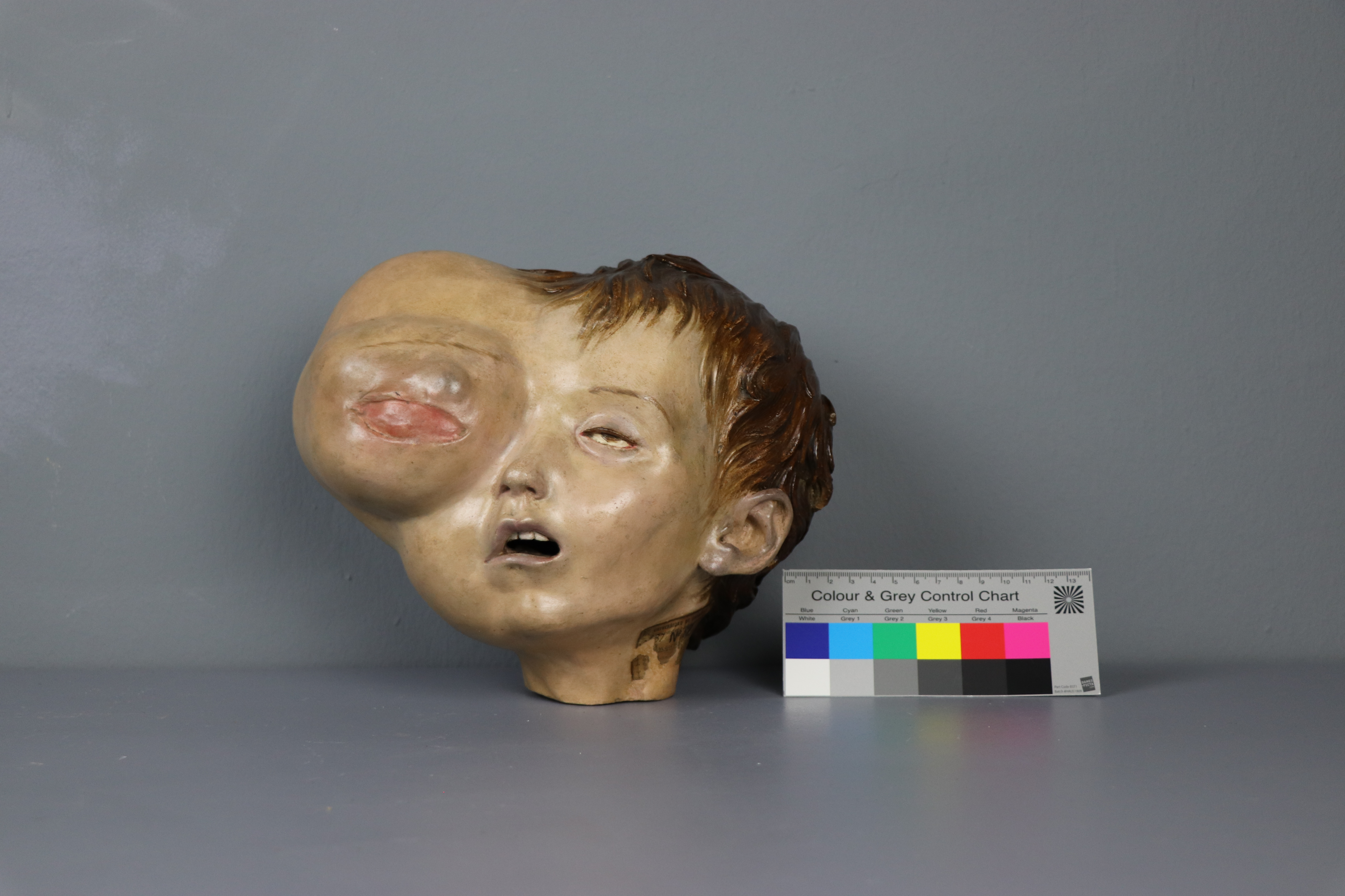 Molde en barro de una cabeza infantil en posición frontal con gran tumoración deformante a nivel del ojo derecho en el que se reconocen los bordes parpebrales que enmarcan la masa tumoral de color rojizo. Esta masa es reondeada, lisa y bien delimitada, de unos 8 cm de diámetro. Se acompaña de pérdida ocular derecha, desviación izquierda de la partura bucal y cierra parcial del ojo izquierdo. Etiquetado original del Museo Anatómico (dañado) en el que aparece el diagnóstico, parte de la numeración orginales (n.º87) y el autor (Morales)
