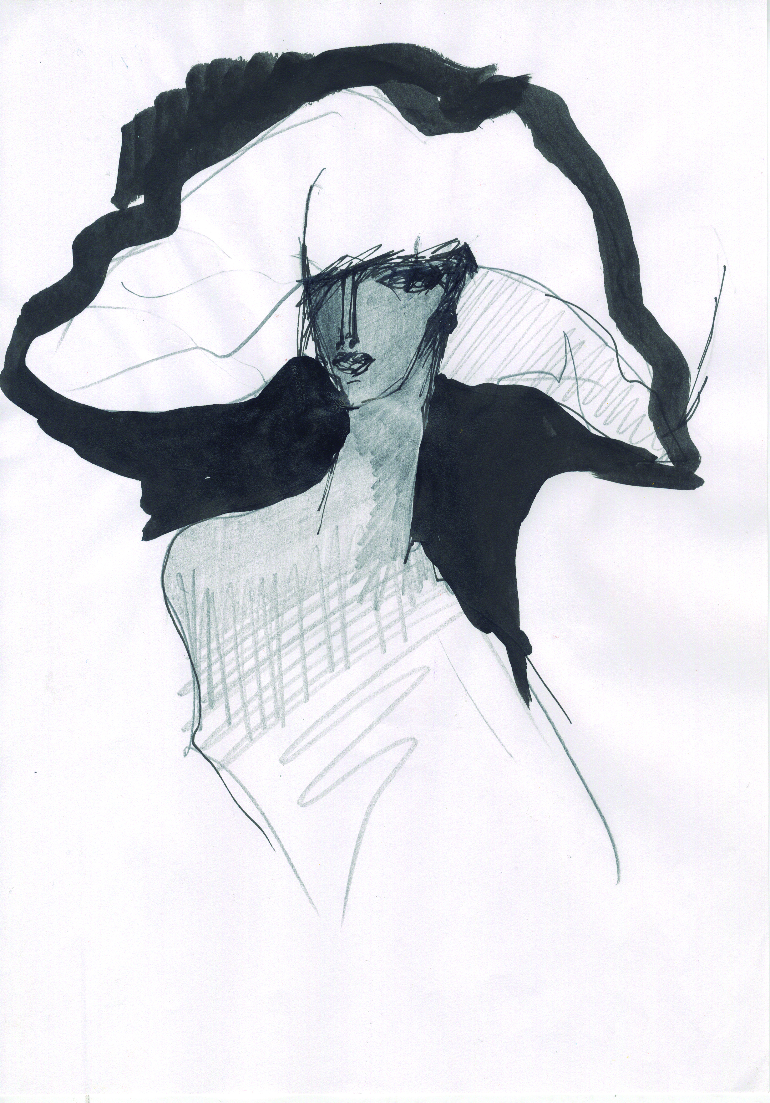 Lámina tamaño A4, en papel de folio sobre marco de cartulina. Se representa un diseño de moda femenino. Se ve el rostro del personaje coloreado a lápiz, por consiguiente en tono gris. Y el sobrero seria blanco y por ello aparece sin color, dándole sobras de color negro al entorno del sobrero para que este destaque en la imagen.