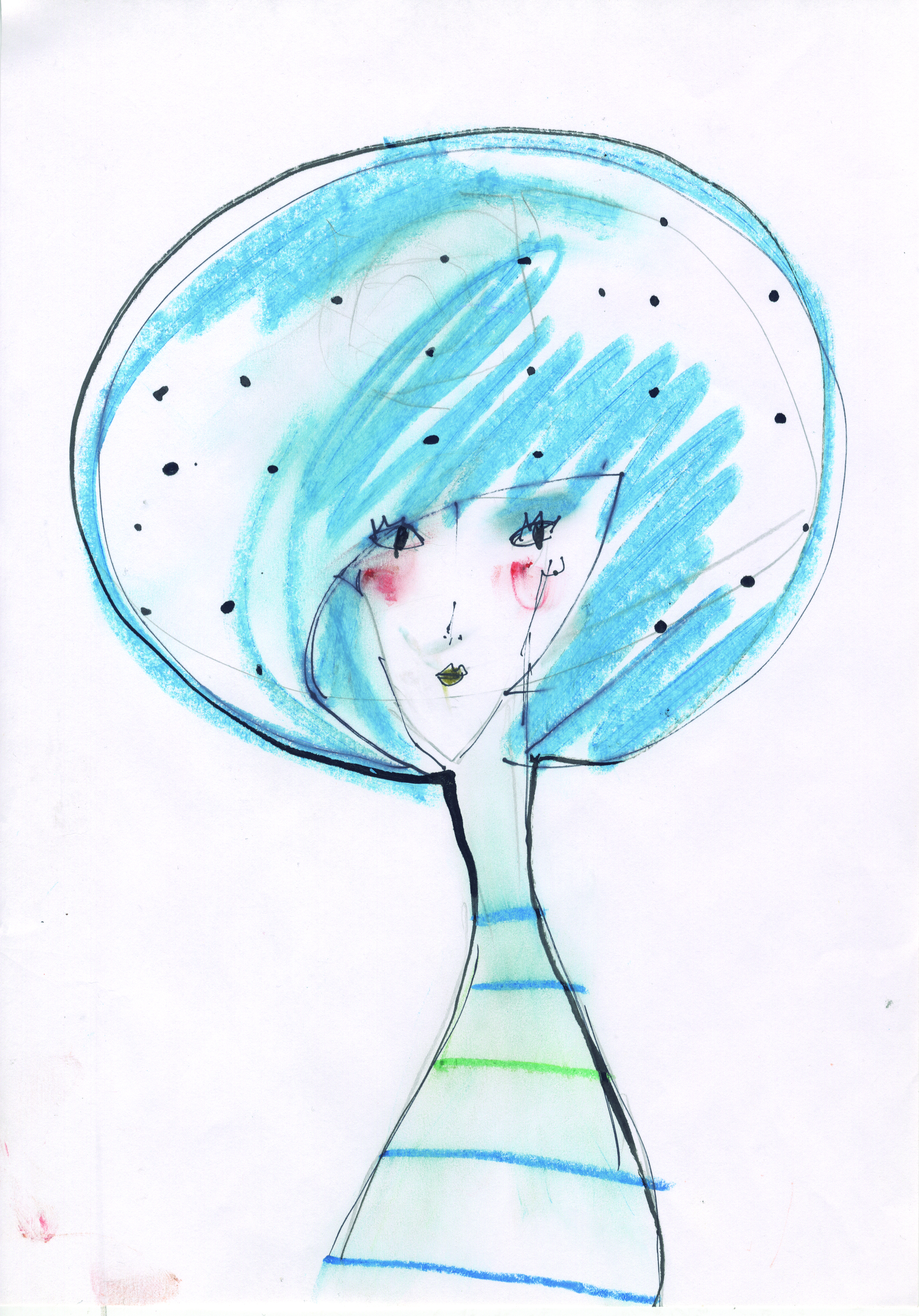 Lámina tamaño A4, en papel de folio sobre marco de cartulina. Diseño de moda femenino, vestido con cuatro líneas de color azul y una línea central de color verde. El personaje lleva un sobrero grande redondo con toques de color azul y puntitos negros. Además, en el rostro del personaje se pueden ver los coloretes rojos de las mejillas.
