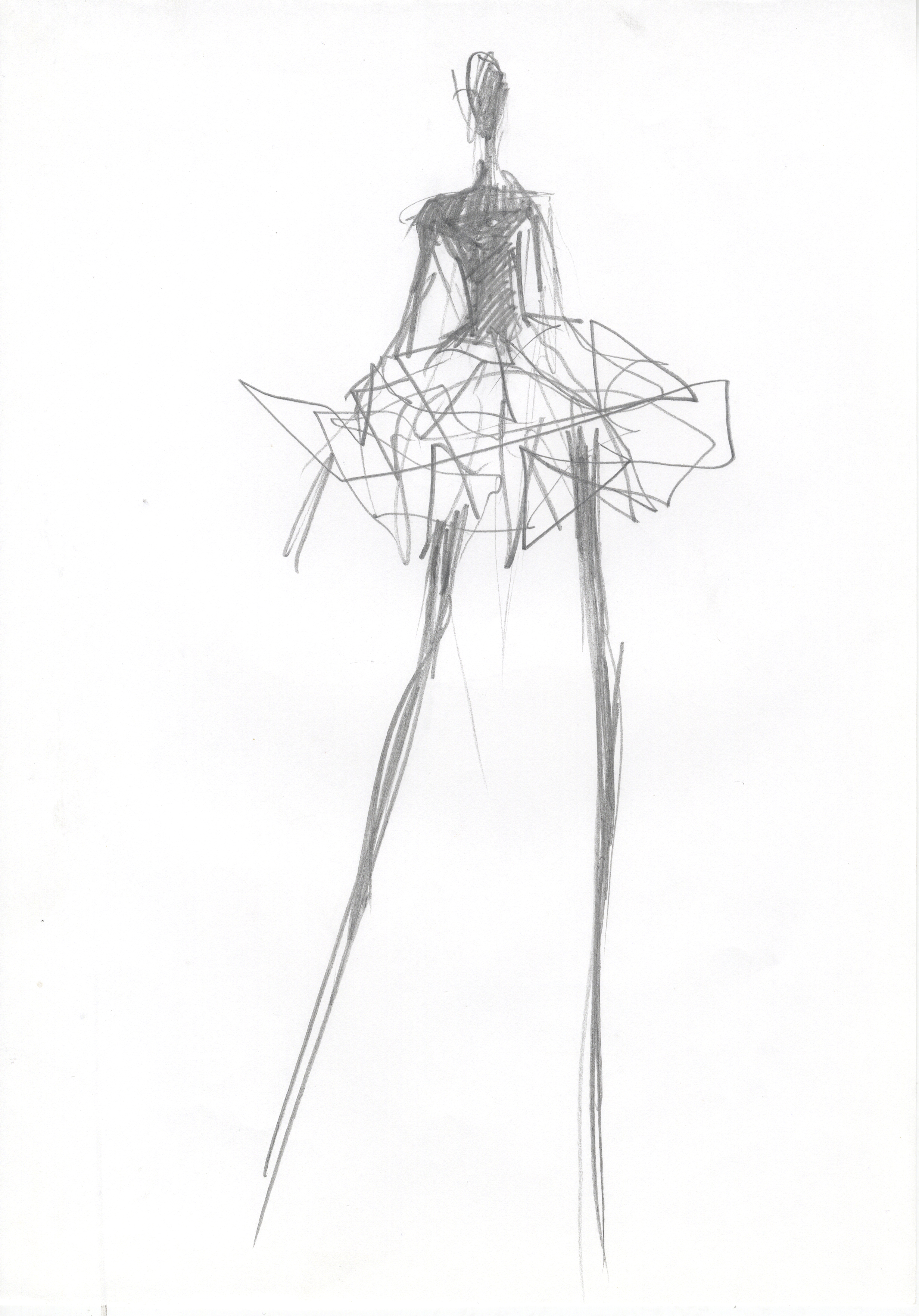 Dibujo que representa un diseño de moda femenino, dos piezas: falda de vuelo y corpiño.