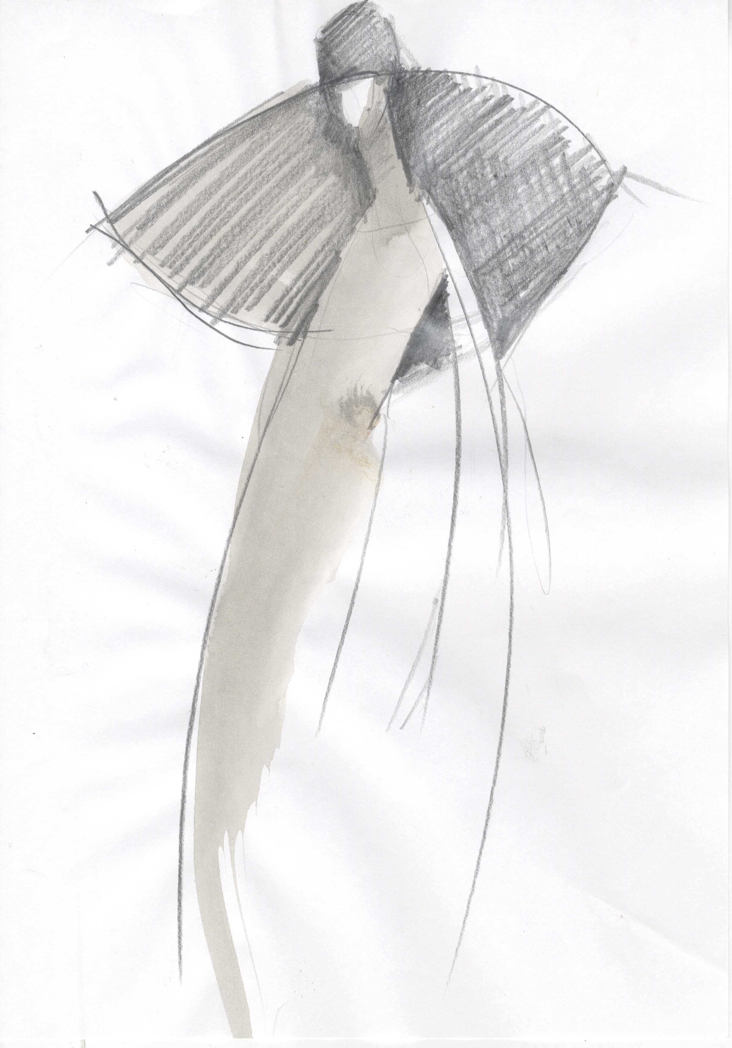 Dibujo que representa un diseño de moda femenino, vestido largo. Además este modelo también presenta una pamela de grandes dimensiones.