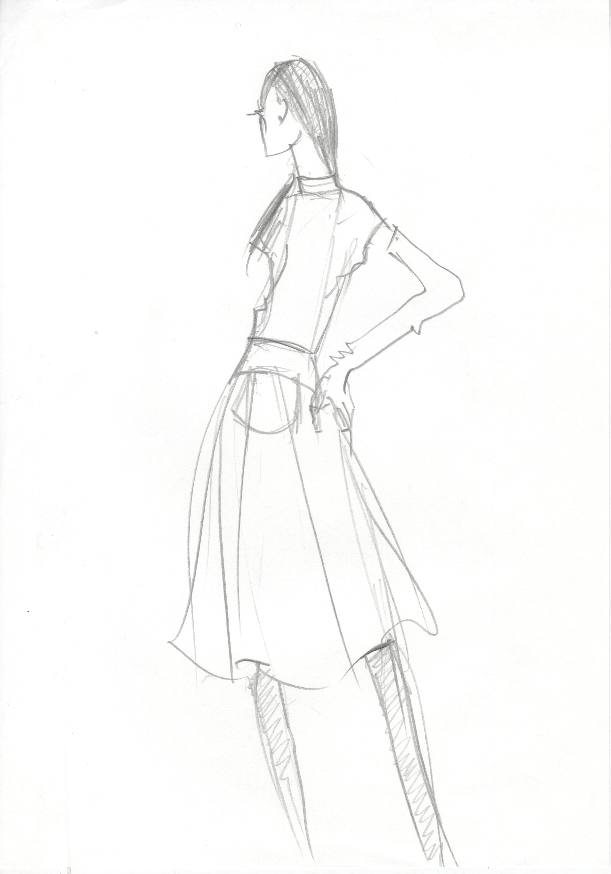 Dibujo que representa un diseño de moda femenino, dos piezas: falda de vuelo a media pierna y camisa de manga corta. Además, posee guantes altos 3/4.