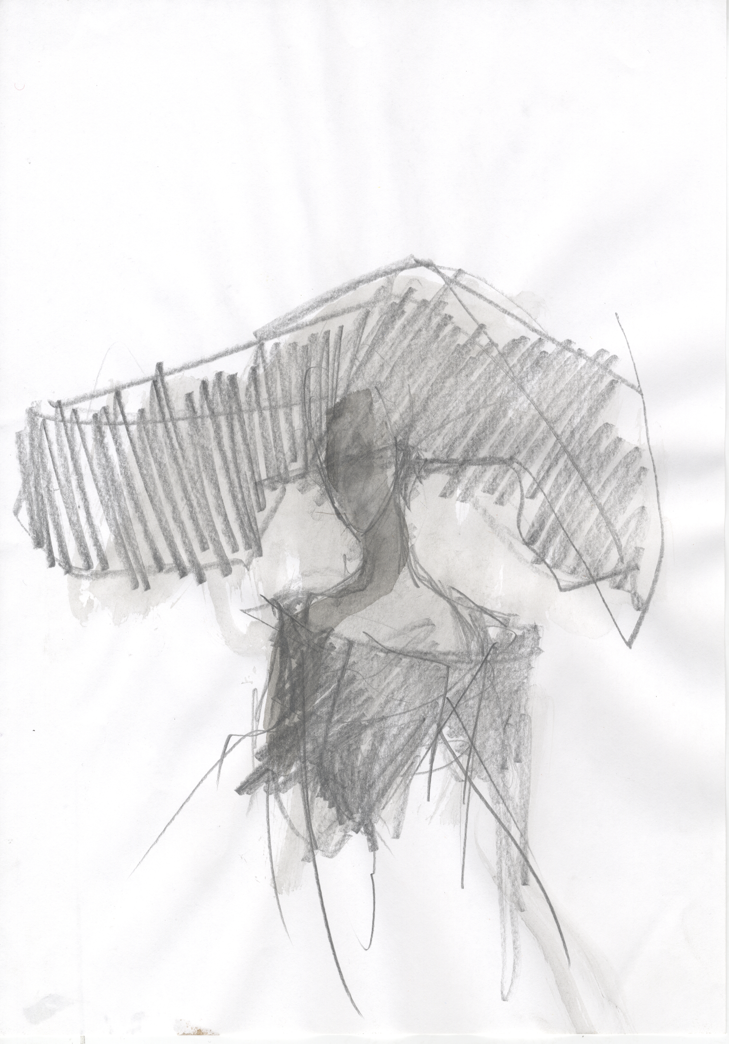 Dibujo que representa un diseño de moda femenino, corpiño que forma parte de un vestido. Además el diseño presenta un gran sobrero.