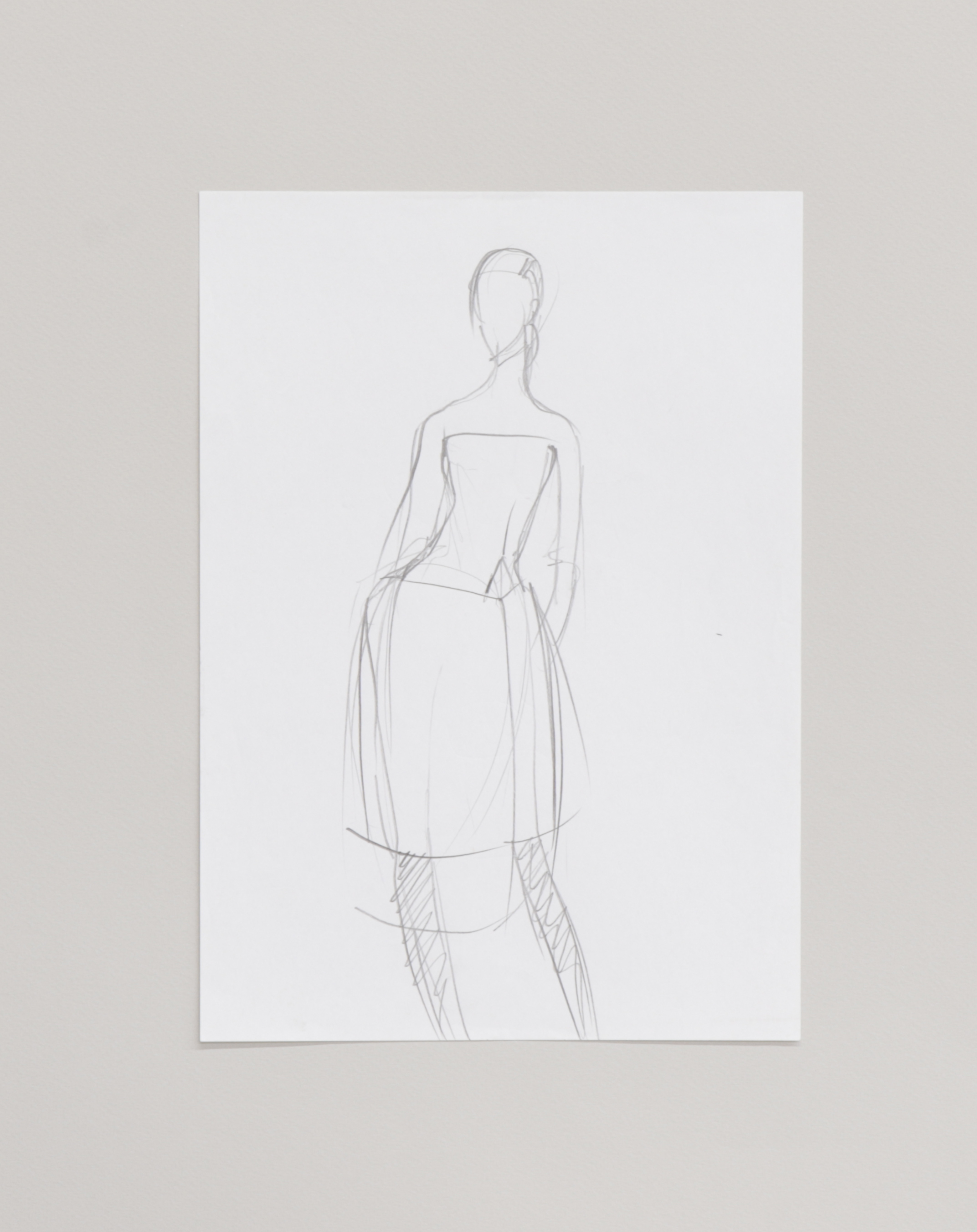 Lámina tamaño A4, en papel de folio sobre marco de cartulina. Dibujo que representa un diseño de moda femenino, dos piezas: falda a media pierna y corpiño con corte palabra de honor.