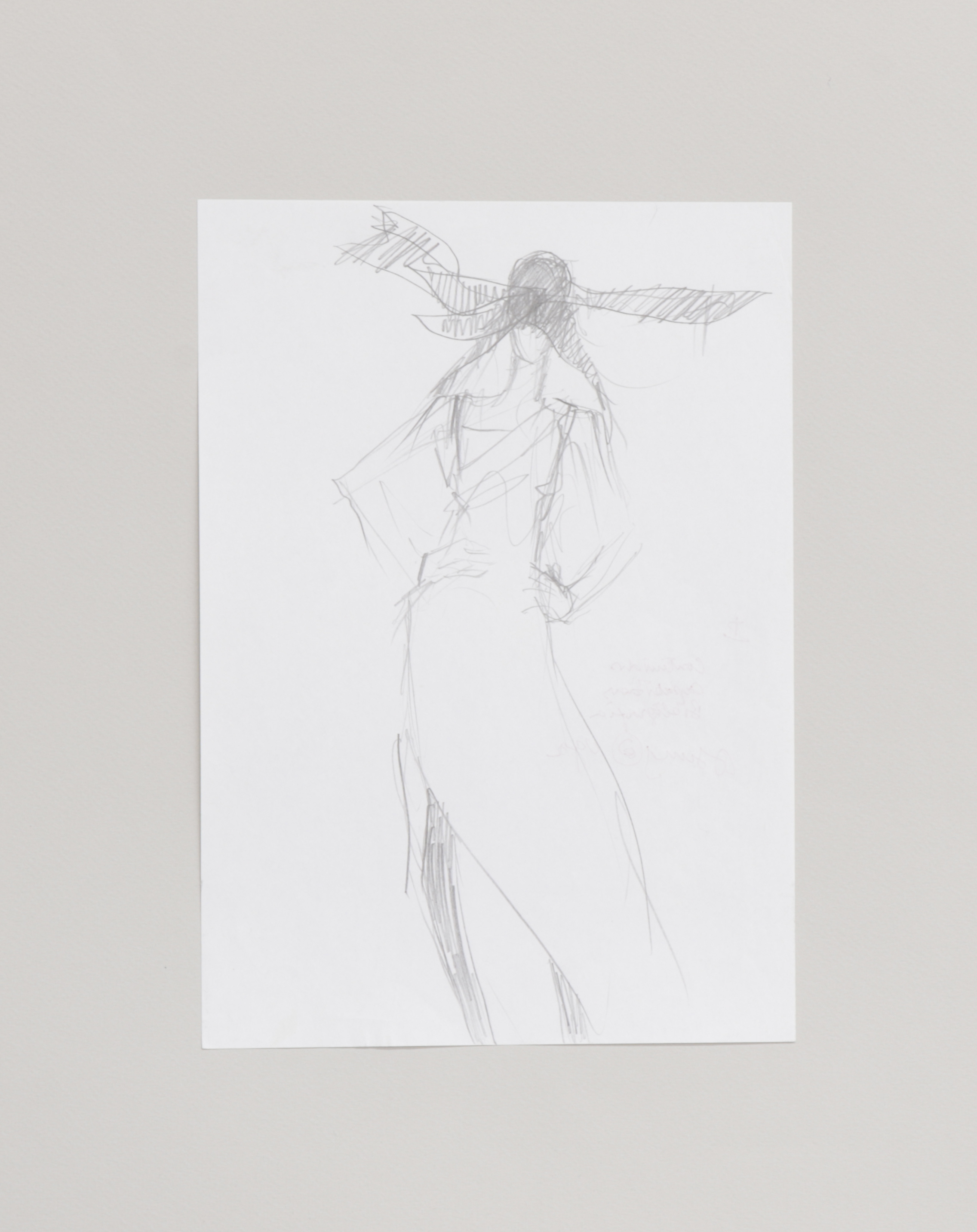 Lámina tamaño A4, en papel de folio sobre marco de cartulina. Dibujo que representa un diseño de moda femenino, vestido de una manga con apertura lateral en la falda hasta la rodilla. Además este diseño posee una gran pamela.