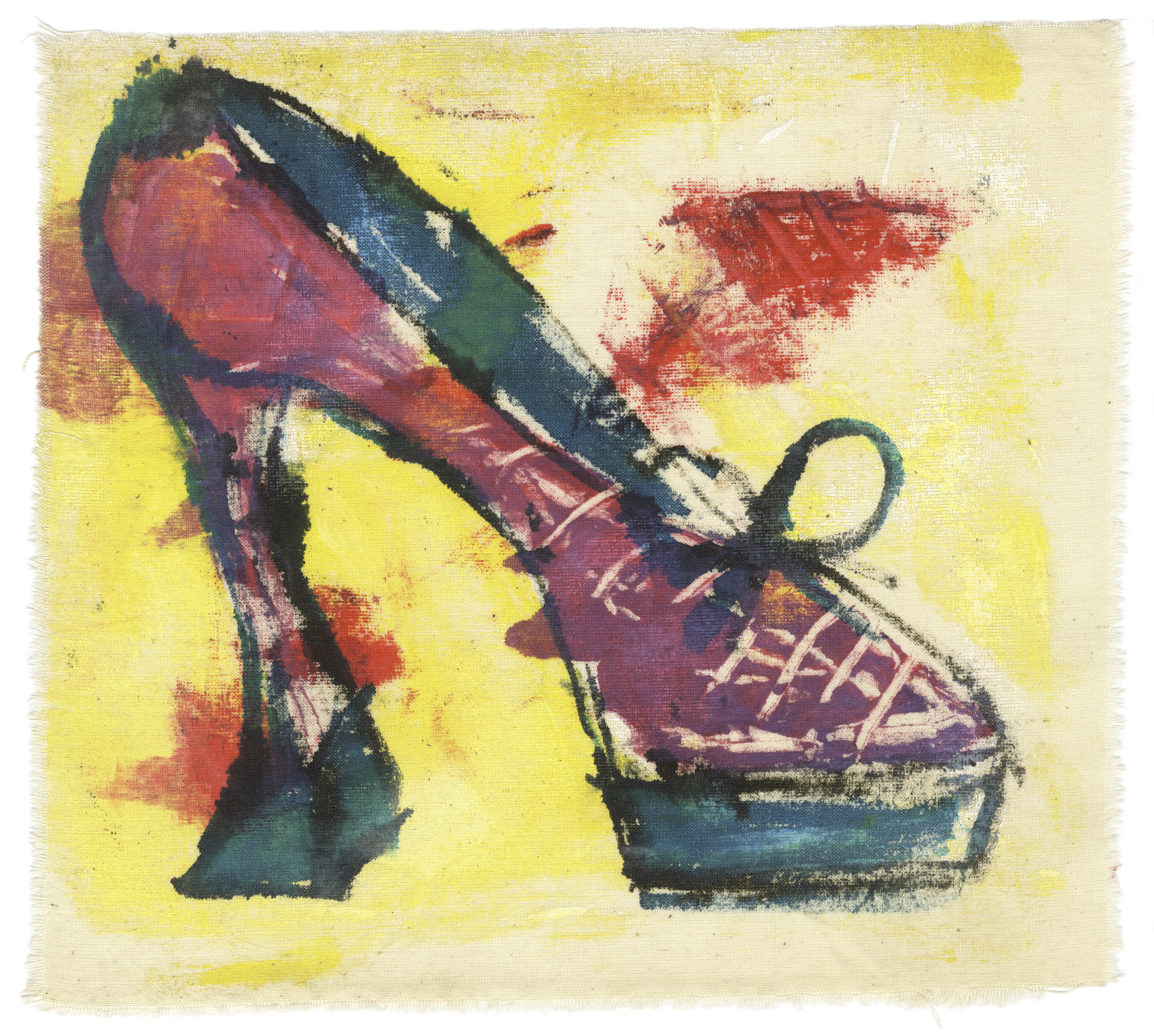 Pintura sobre lienzo sin preparación del soporte. Zapato de tacón con plataforma y una moña. El zapato es de color rojizo mientras que el interior del zapato y la plataforma de éste son en tonos verdosos, sobre un fondo amarillo con manchas de color propias del proceso de trabajo.