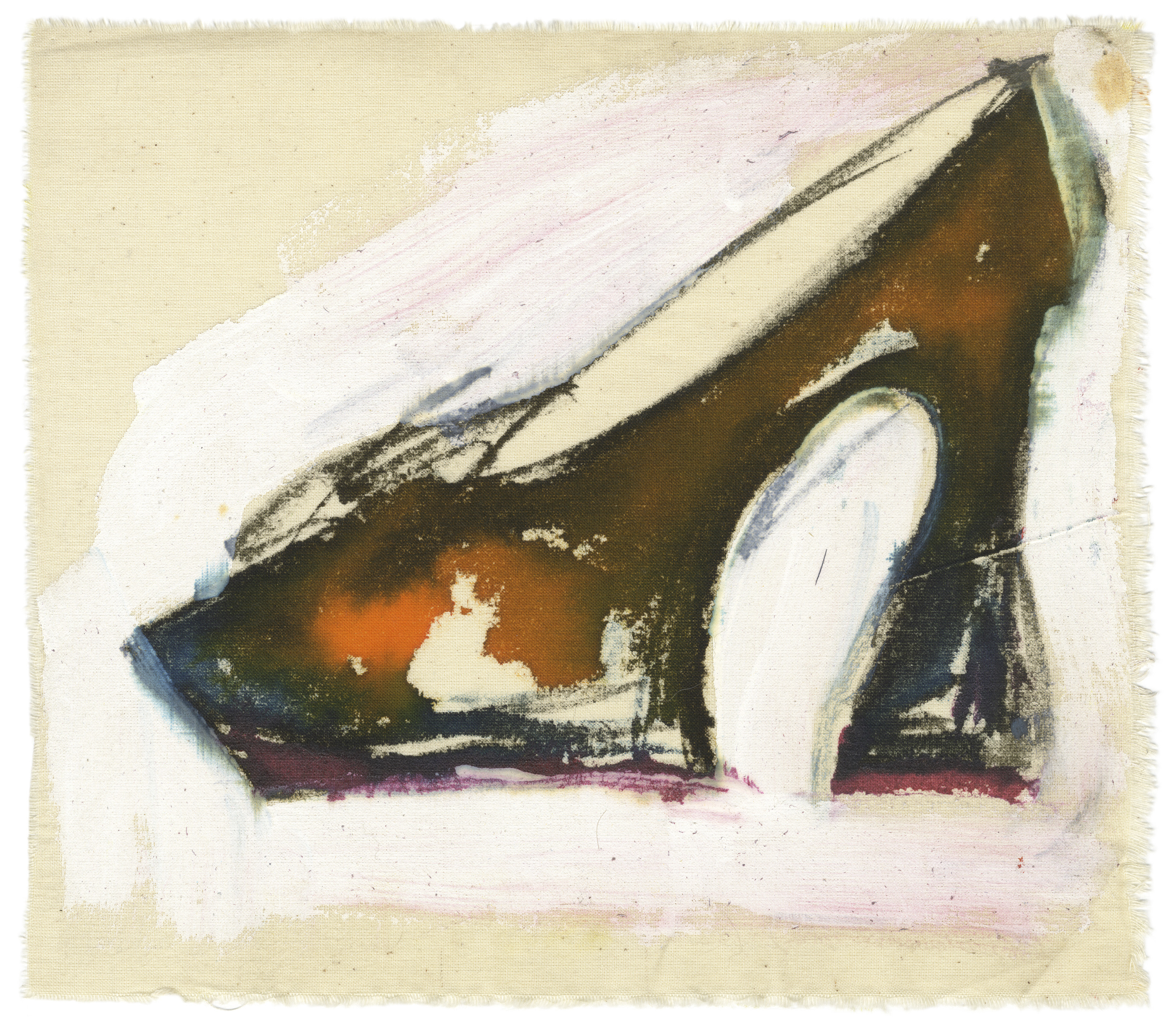 Pintura sobre lienzo sin preparación del soporte. Zapato de tacón con plataforma y decorado con motivos geométricos. El zapato combina los colores azul, naranja, rojo y blanco, sobre un fondo blanco con manchas de color propias del proceso de trabajo.