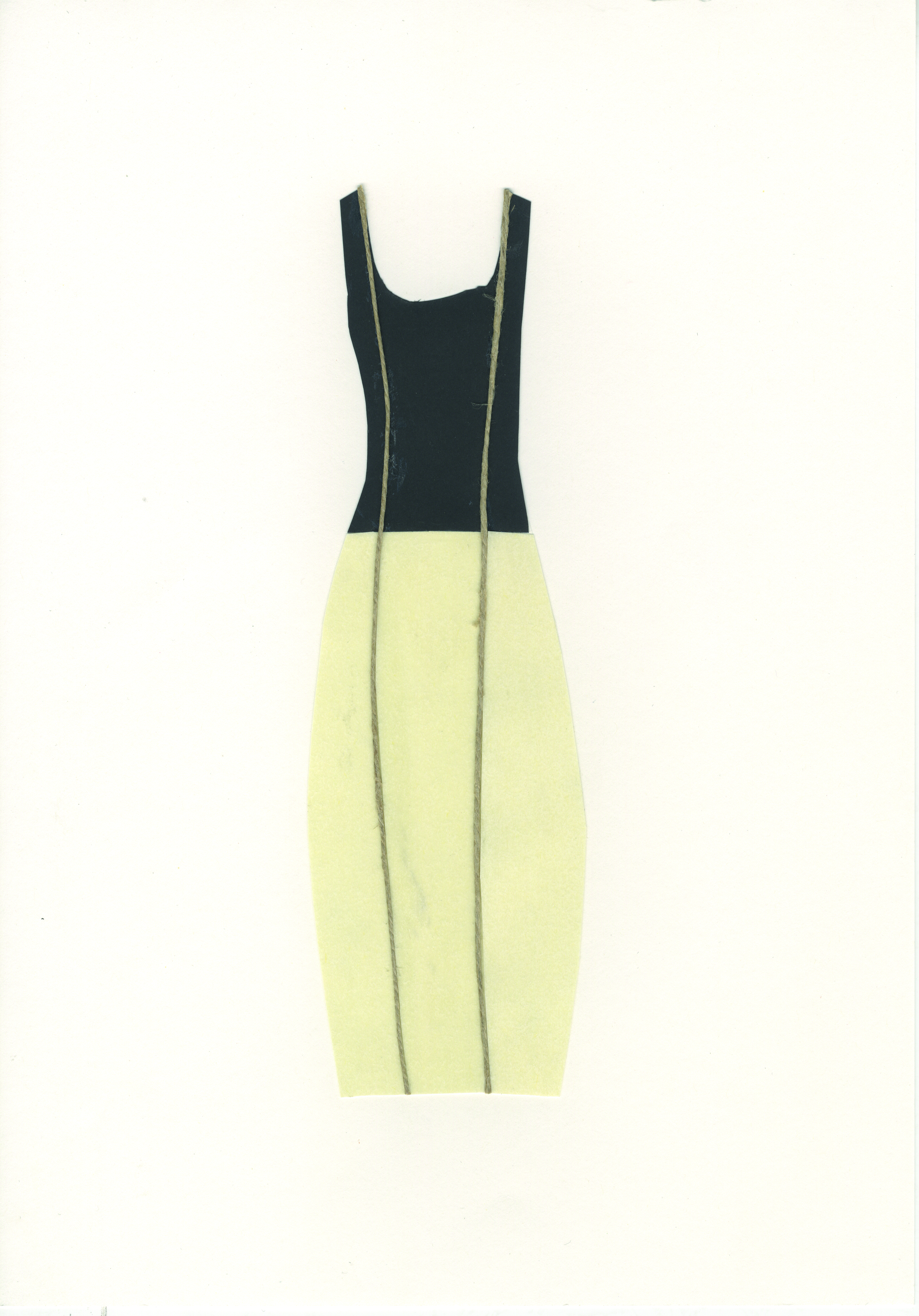 Diseño de moda realizado mediante la técnica del collage. Representa un vestido formado por falda blanca y corpiño negro recortados en cartulina. Recorren el largo de la prenda, desde los hombros hasta el dobladillo del bajo, dos líneas verticales a base de cuerda, pegadas a modo de decoración.