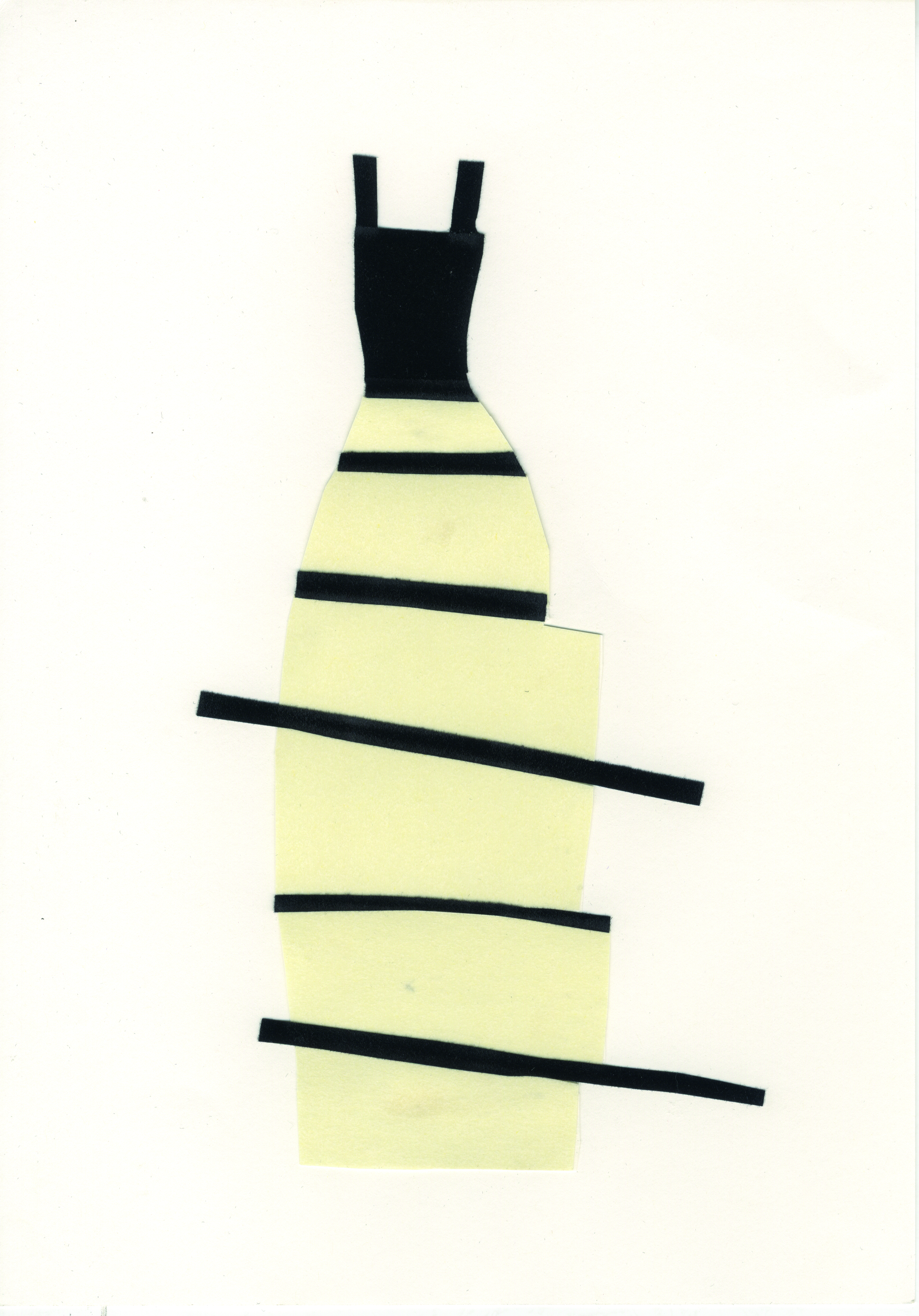 Diseño de moda: vestido. El vestido se elabora sobre papel mediante la técnica de collage, con adición de papel adhesivo de fieltro para el corpiño y papel para la falda, sobre la que se superponen líneas negras también recortadas en papel adhesivo de fieltro y aplicadas creando secciones transversales.