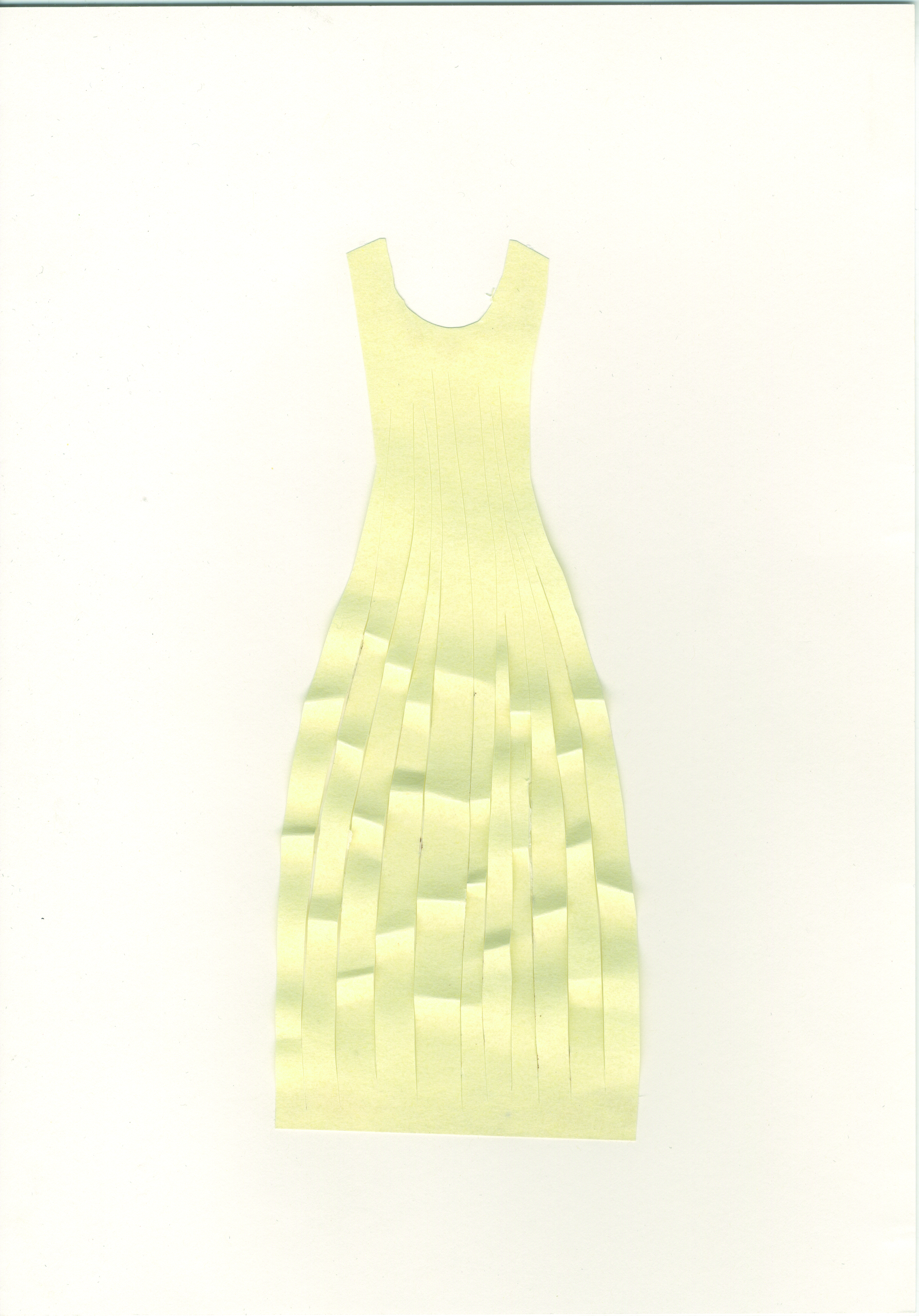 Diseño de moda realizado mediante la técnica del collage. Formado por una sola pieza de papel de color beige claro, un vestido largo con escote redondo y tirantes muy anchos cuenta con una decoración generada a partir de la textura del propio papel, sobre el que se han producido secciones verticales que no llegan a tocar el bajo del vestido y a las que se aplican pequeños dobleces para insinuar volumen y estructura.