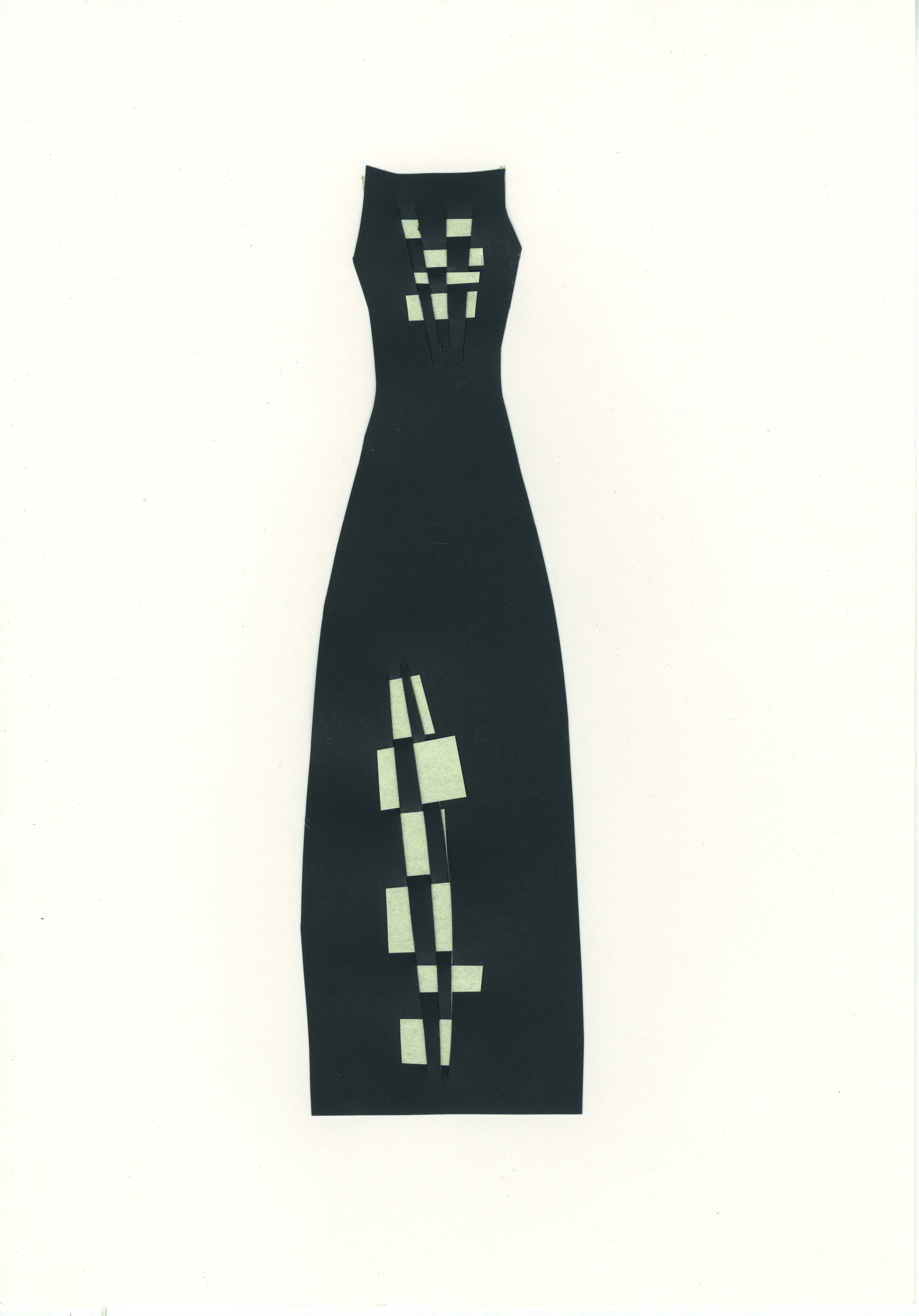 Diseño de moda realizado siguiendo la técnica del collage. Vestido largo en una pieza, recortado en cartulina negra que se decora con notas blancas mediante la inserción de piezas de papel blanco en las aberturas verticales practicadas en la cartulina.