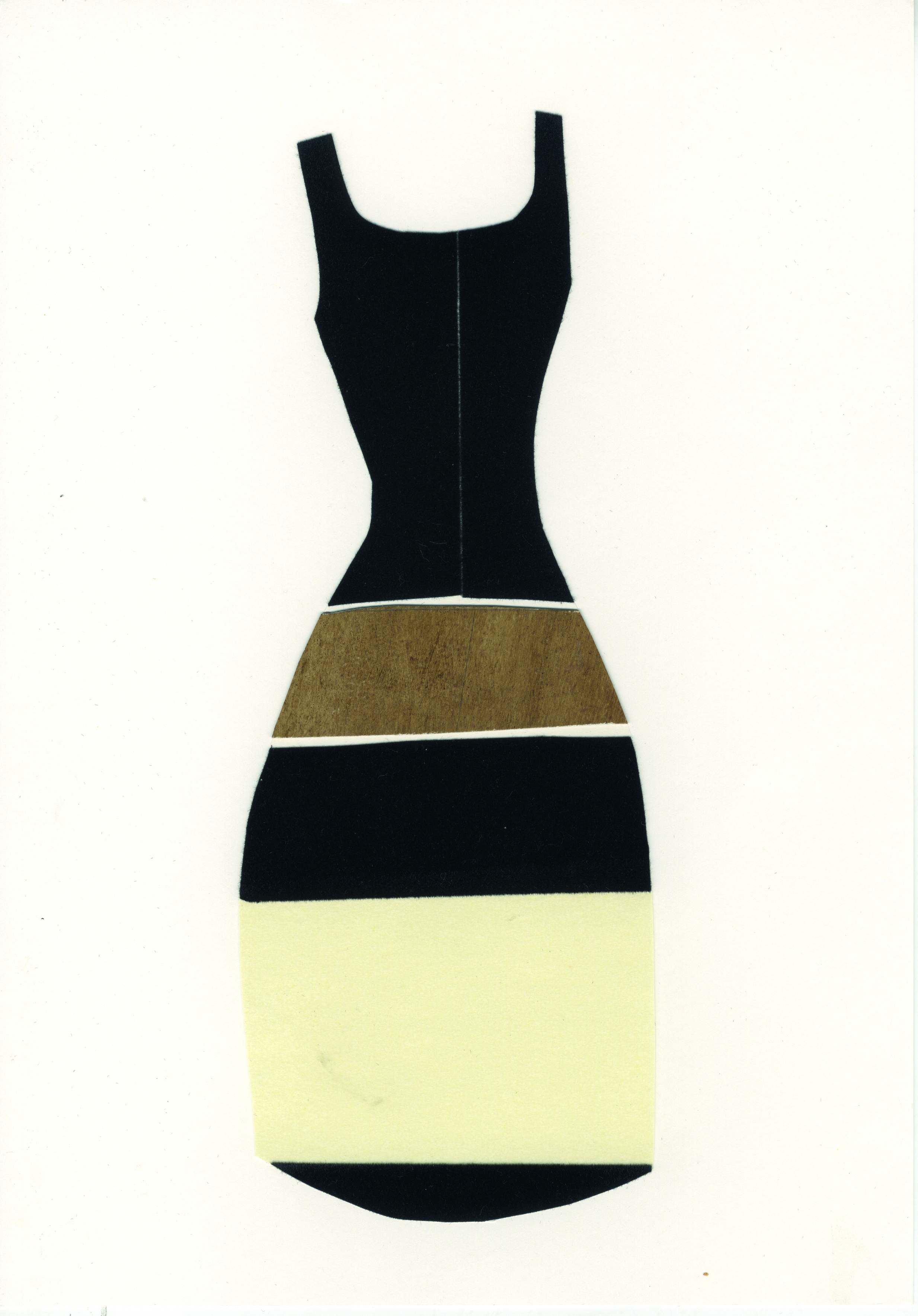 Diseño de moda realizado mediante la técnica del collage. Representa un vestido formado por falda y corpiño, siendo este de tirantes y amplio escote, formado por dos piezas simétricas verticales recortadas en papel adhesivo de fieltro negro. La falda, compuesta por cinco bandas transversales, alterna el uso del negro recortado en el mismo material del corpiño, con papel blanco y cartón marrón.