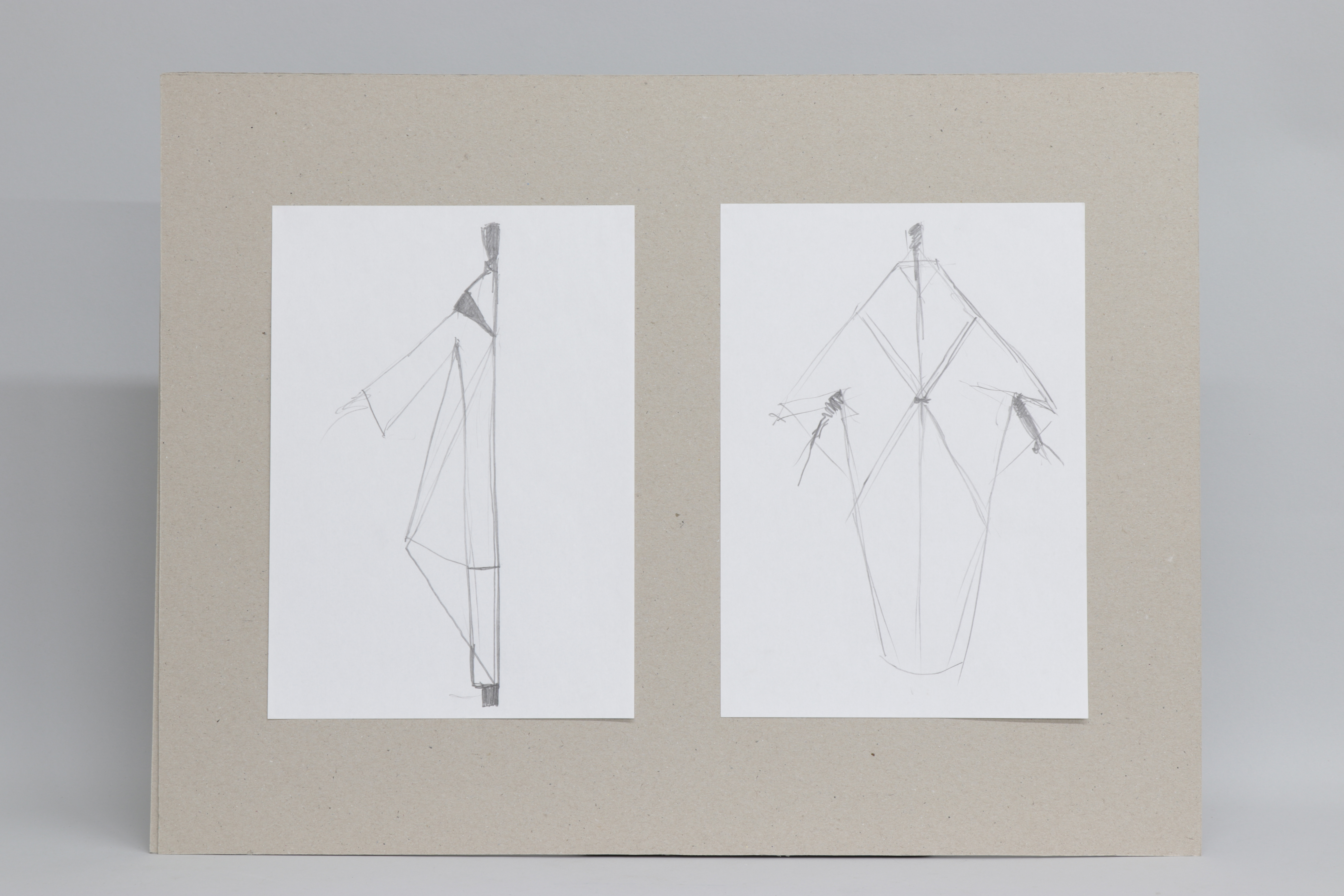 Cartón compuesto por dos dibujos en papel blanco A4. Ambos representan un patrón o diseño de moda. Un figurín viste un vestido o abrigo de amplio volumen que se recrea en los dos dibujos: el primero es una vista paracial, dividiendo el cuerpo del figurín y la prenda siguiendo su eje de simetría vertical y el segundo dibujo, mucho más esquemático si cabe, muestra una vista trasera completa.