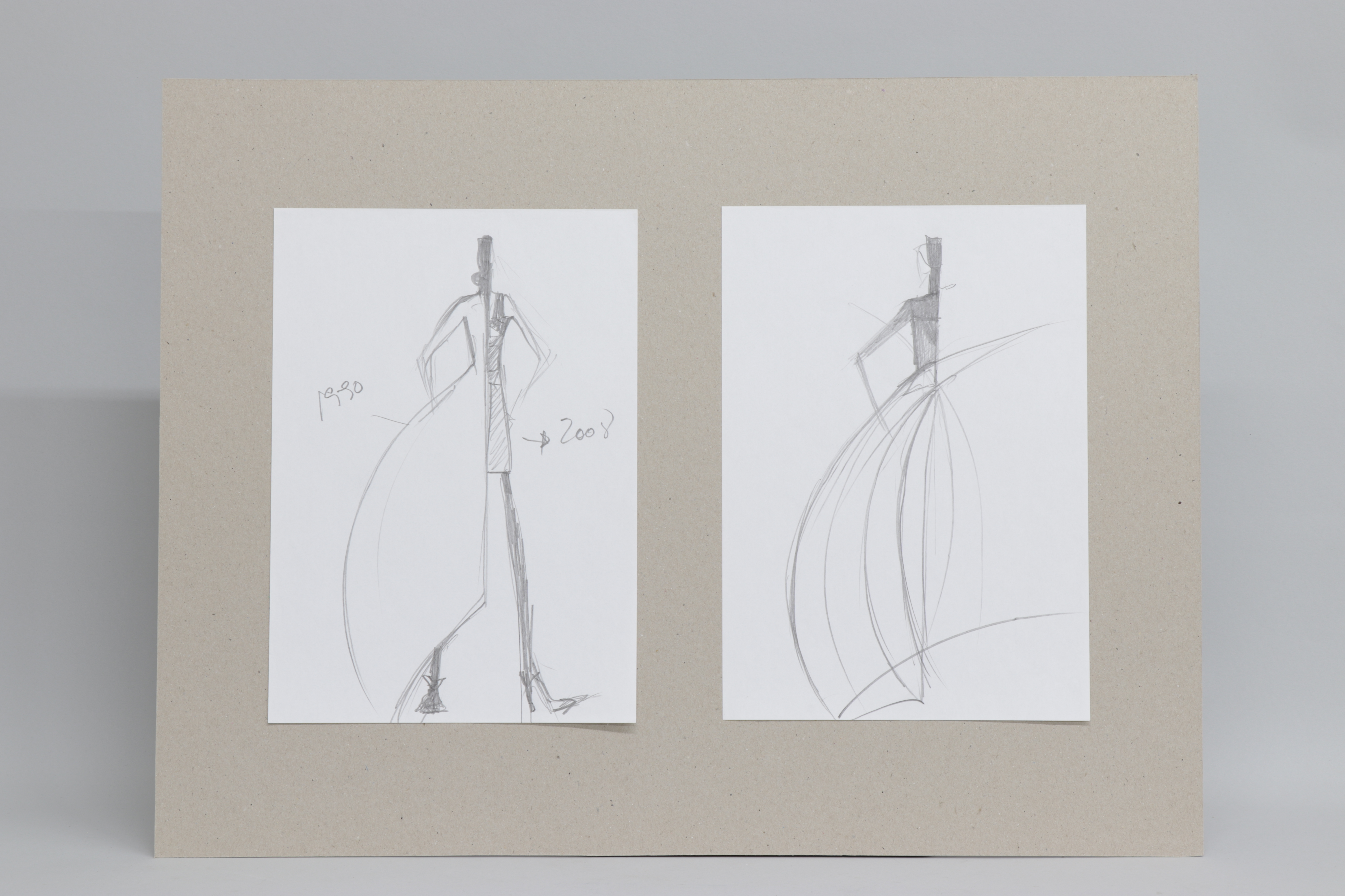 Cartón compuesto por dos dibujos en folio A4. Ambos representan un patrón o diseño de moda. Figurines sin rostro o modelo humano utilizado exclusivamente como soporte para crear el diseño de moda.