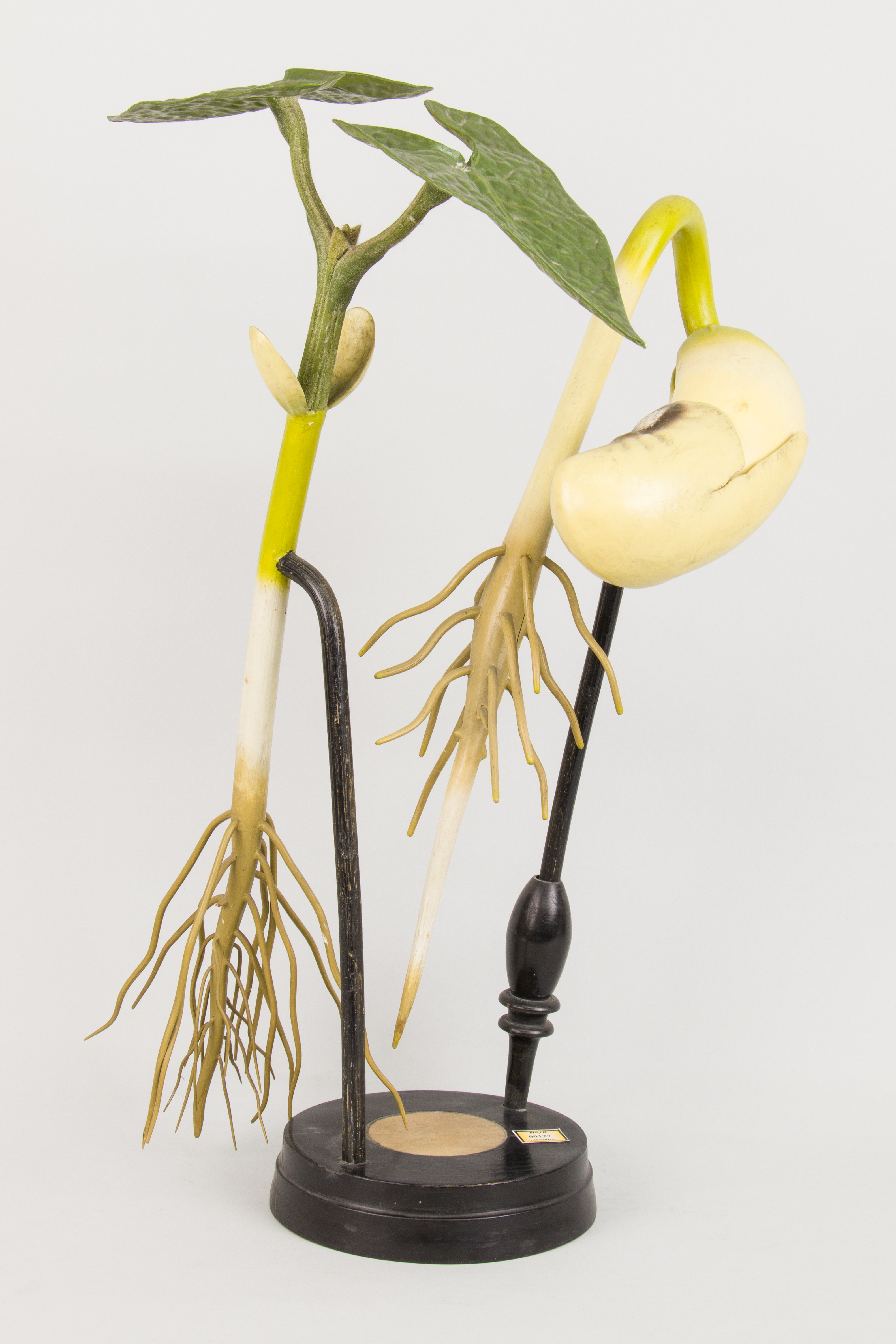 El modelo permite ver, ampliadas, dos fases de la germinación de una planta dicotiledónea, concretamente una leguminosa: una primera fase del proceso donde la cubierta que protege la legumbre se ha roto a causa de la presión de turgencia dejando paso a la salida del meristema apical de la raíz; por otro lado, nos muestra un estadio más avanzado de la germinación donde los cotiledones ya se han separado y se han formado las dos primeras hojas flanqueando el meristema apical del vástago.