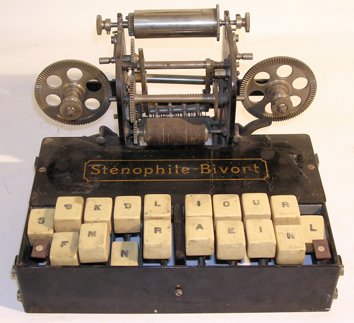 Aparato para realizar taquigrafía a máquina. La pieza contiene las siguientes inscripciones insertas en la obra: "Stènophile-Bivort" y "BREVETS EN TOUS PAYS" /"Nº 1206 PARIS B".