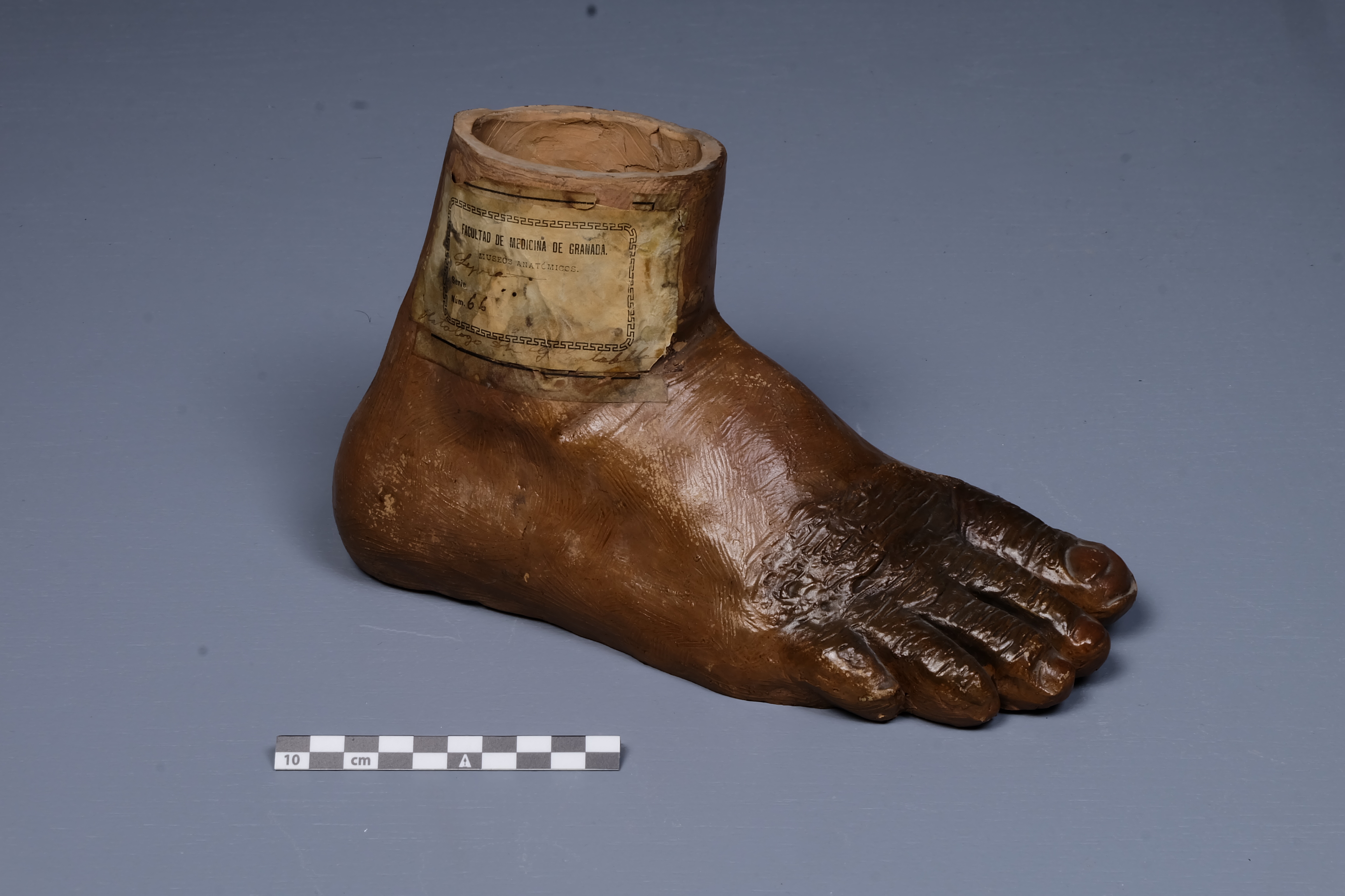 Modelo en barro de pie derecho con lesión dérmica en banda de color pardo- marrón que afecta al tercio distal del pie y dedos. Se acompaña de onicolisis. Presenta etiquetado original del Museo Anatómico que consta con el diagnóstico, la numeración (n.º 66) y el catálogo (Dr. Entralla)