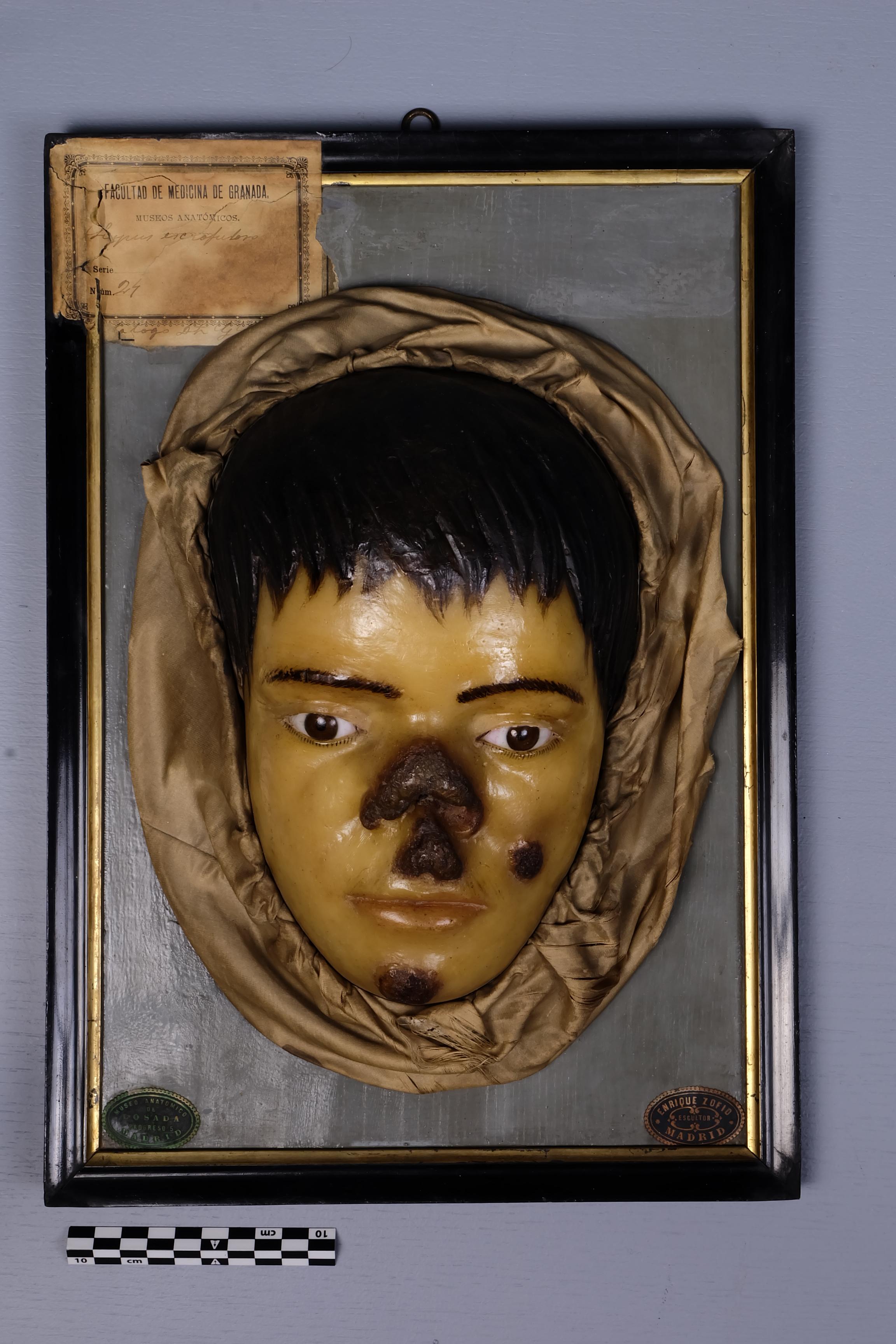 Molde de la cara de un varón joven en posición frontal con lesiones que interesan a las regiones nasal, labial superior, geniana y mentoniana. Muestra una lesión altamente deformante a nivel de la base y las alas de la nariz, rugosa e irregular y de color oscuro. El resto de las lesiones son circulares, de desigual tamaño y color pardo oscuro. Etiquetado original del Museo anatómico en el que consta el diagnóstico, la numeración (nº24) y el catálogo (Dr. Entralla). En ambos ángulos inferiores hay una pequeña chapa metálica con la inscripción de LOSADA en el ángulo izquierdo y E. ZOFIO en el derecho.