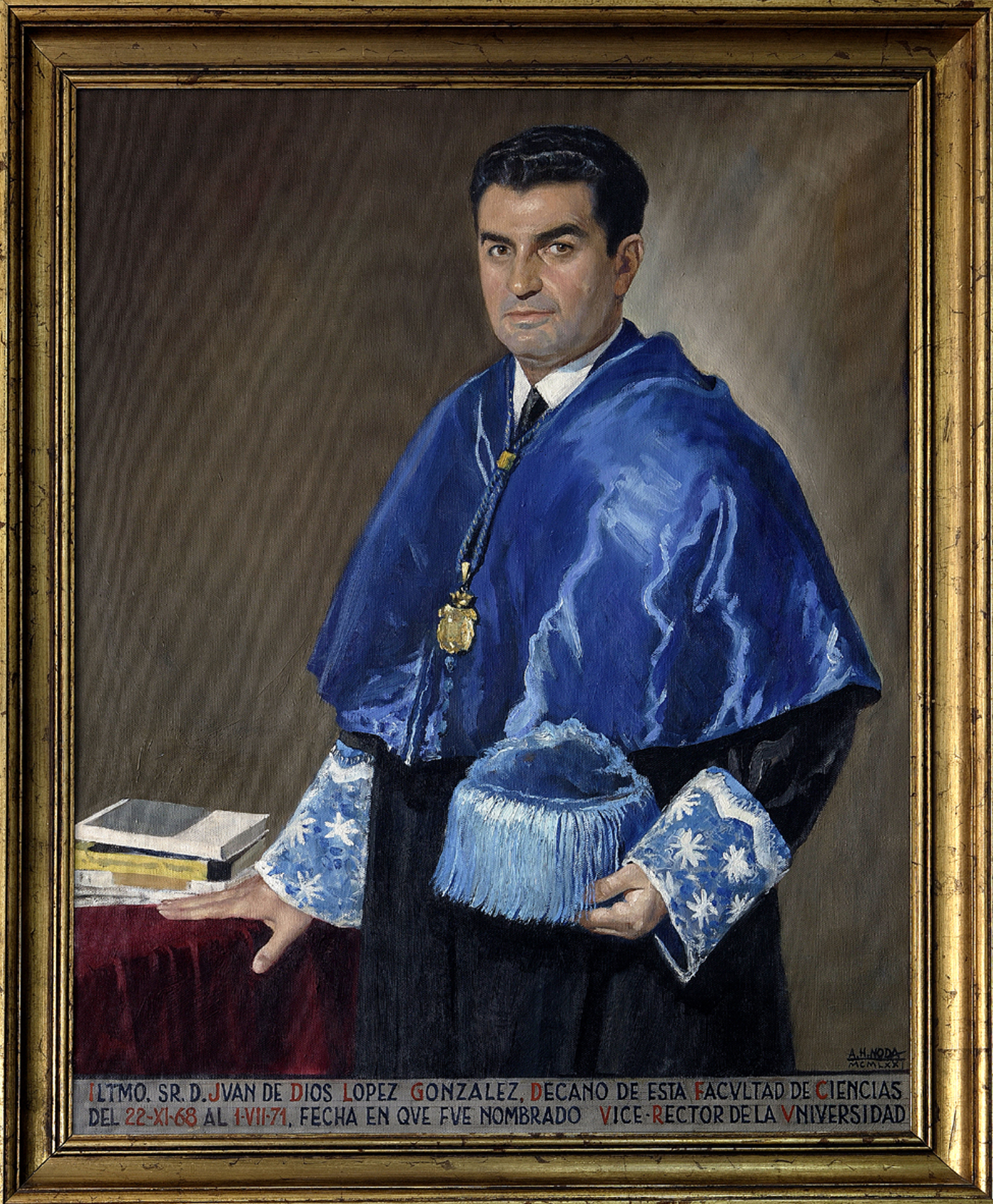 La obra está fechada y firmada por su autor, "A. H. NODA / MCMLXXI", en el ángulo inferior derecho. Además, en el margen inferior hay una inscripción que dice "ILMO. SR. D. JUAN DE DIOS LOPEZ GONZALEZ, DECANO DE ESTA FACULTAD DE CIENCIAS / DEL 22-XI-68, FECHA EN QUE FUE NOMBRADO VEICE-RECTOR DE LA UNIVERSIDAD".