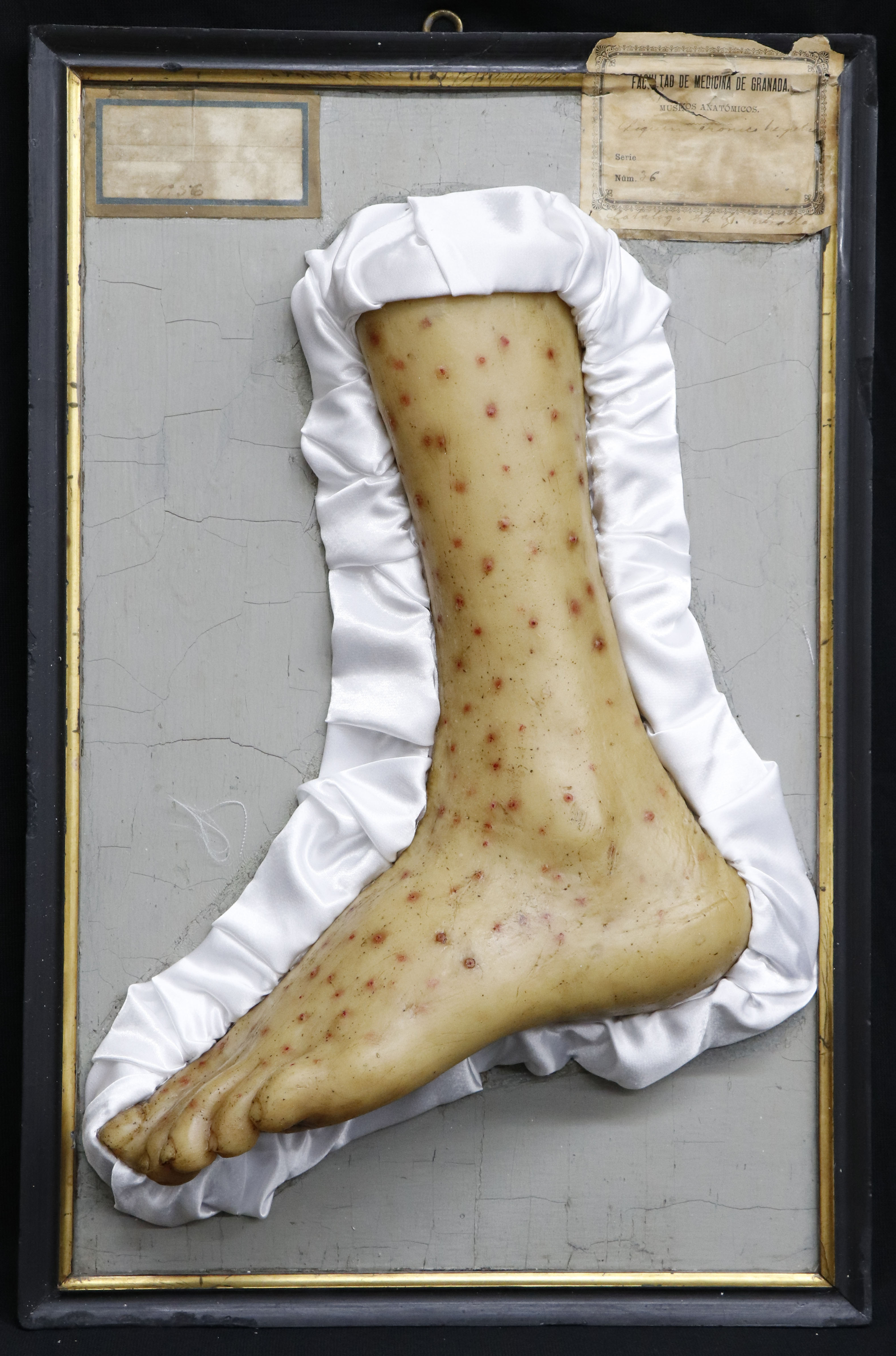 Molde de cera del tercio distal y cara externa de pierna y pie izquierdos sobre tabla de madera enmarcada con múltiples pápulas y vesículas de pequeño tamaño, de coloración rojiza, alguna de las cuales se encuentran deprimidas en el centro y blanquecinas en su superficie. Etiquetado original del Museo Anatómico, con el diagnóstico y numeración (n.º 36) y catálogo (Dr. Entralla). Posee otra etiqueta en papel en el que consta el nombre del hospital (H. S. Juan de Dios), el diagnóstico y el médico Olavide, además de una doble numeración (n.º 46 y 36). En la parte posterior, muestra una lámina original en papel con la historia clínica detallada.