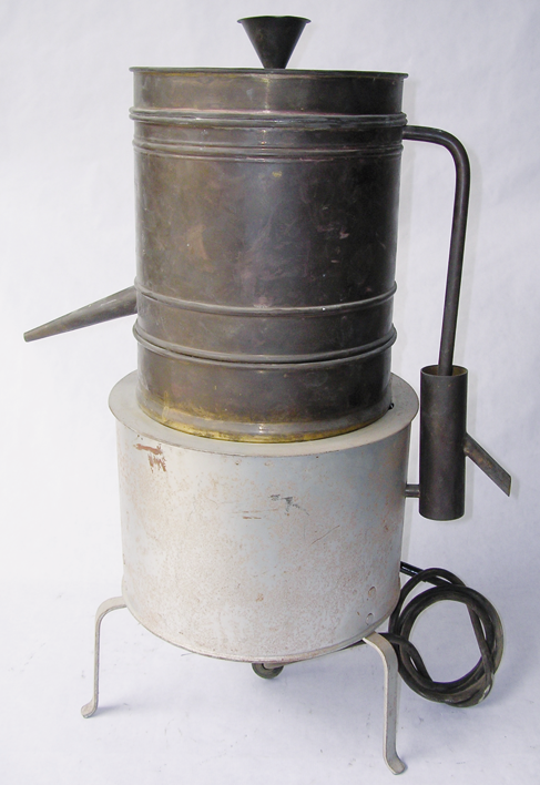 En este caso, el calor se genera mediante un calefactor eléctrico situado en la parte inferior gracias al cual se produce la evaporación del líquido. Este vapor pasa, mediante un conducto, al compartimento superior donde se encuentra el serpentín, tubo en forma de espiral gracias al cual se produce la condensación de ese vapor por enfriamiento. El resultado final sale del destilador por la fina boquilla conectada a la parte inferior del serpentín.