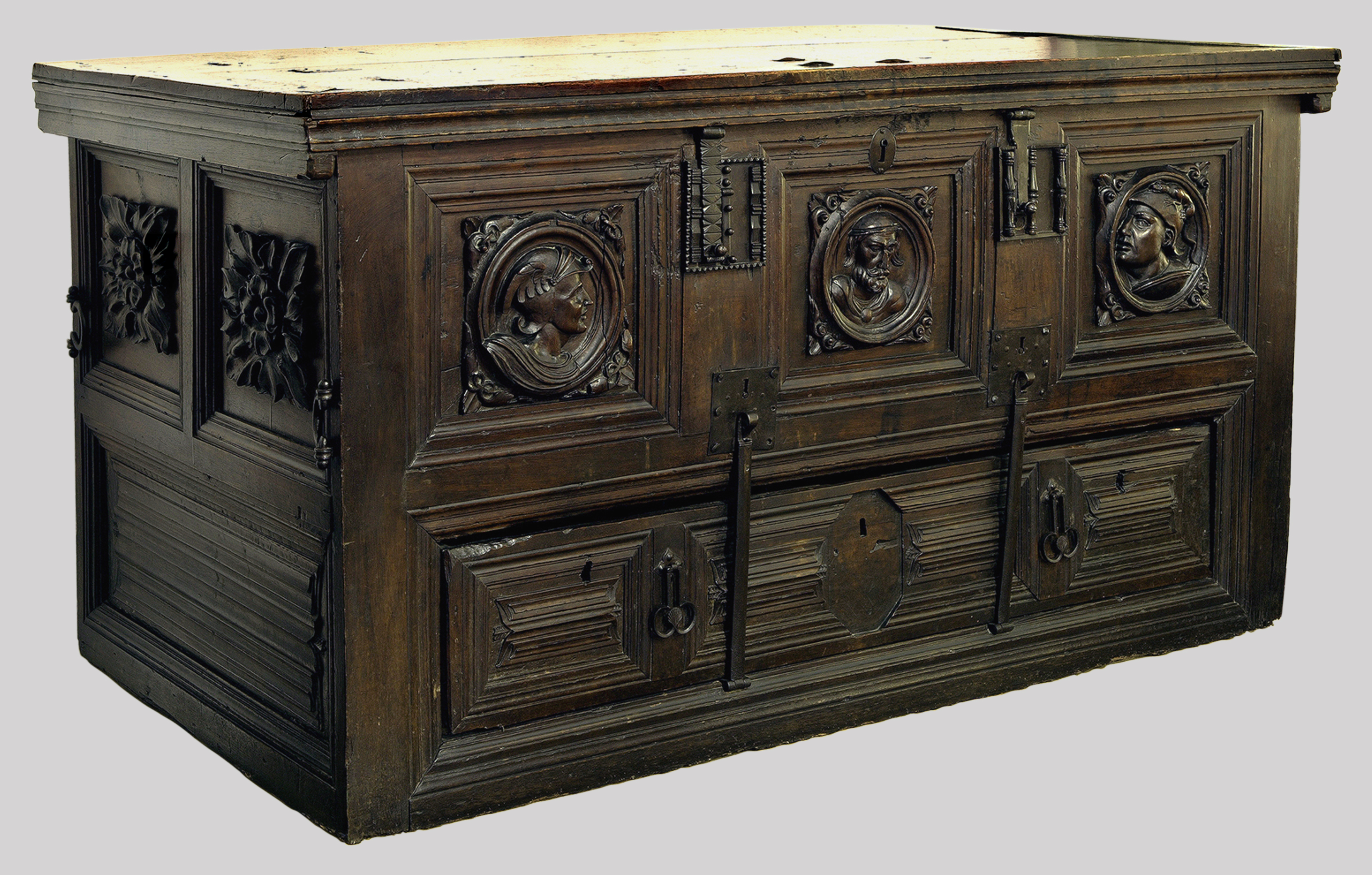 Arca de caudales con cuatro asas laterales de hierro, con decoración tallada en sus cuatro frentes, divididos en dos cuerpos. El cuerpo bajo está formado por cuarterones rectangulares con talla de rollos apergaminados, constituyendo en la parte frontal un cajón con tiradores metálicos y herrajes verticales. El cuerpo superior presenta en los laterales dos rosetas vegetales de talla algo tosca y un programa iconográfico de medallones con rostros humanos en los frentes anterior y posterior. En el anterior, dos figuras de perfil, una con casco alado y otra con un lagarto sobre su casco, flanqueando a otra figura, barbada, que mira de frente. En el posterior, dos perfiles, uno barbado con una cinta en el pelo y otro de aspecto maduro, flanquean la figura de una joven mujer que mira de frente. Se desconoce el sentido de dicho programa, ya que se ignora la procedencia de este mueble. La tapa es lisa, con herrajes verticales que se acoplan a una cerradura decorada con balaustres.