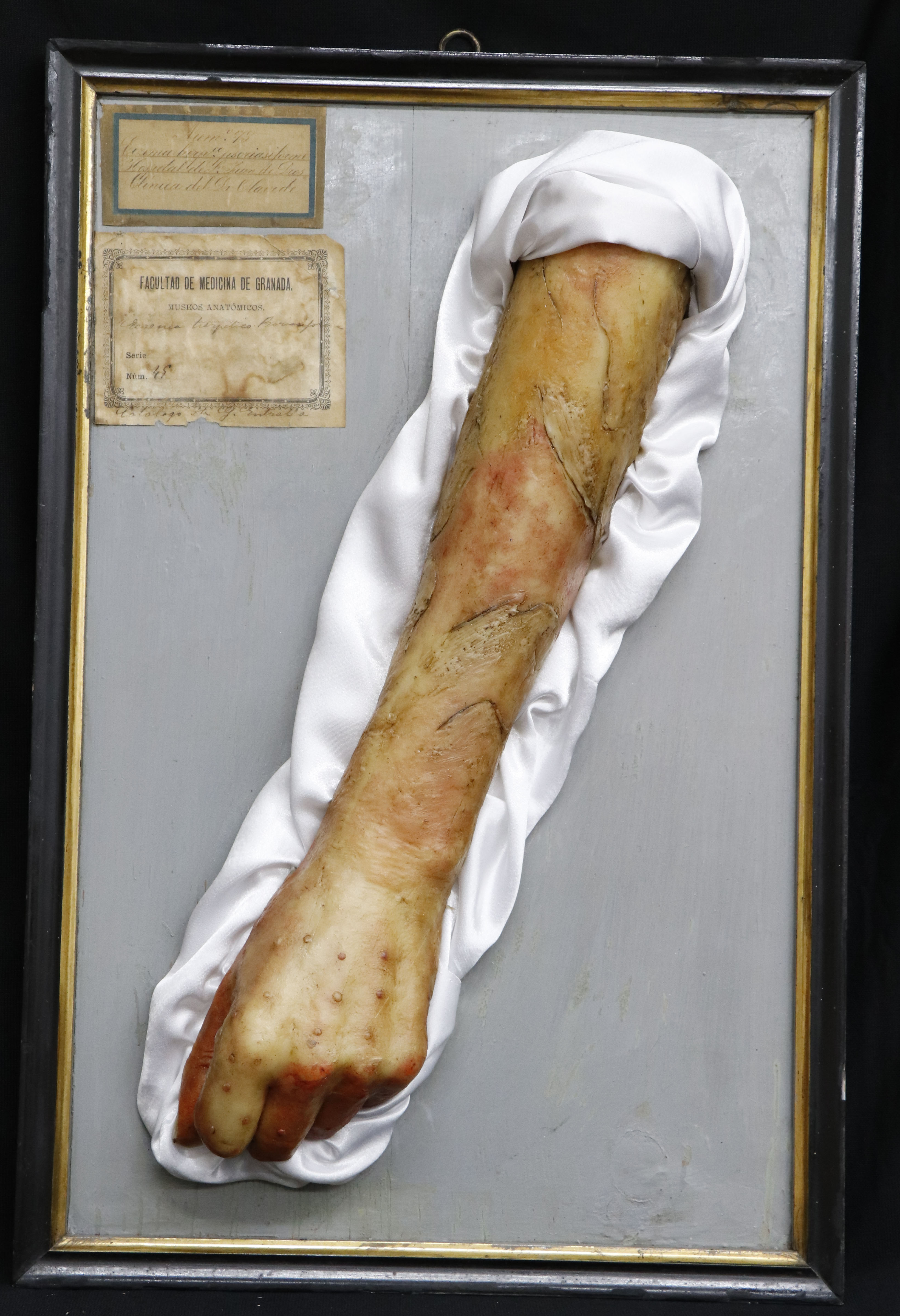 Molde en cera que representa la cara dorsal del antebrazo y mano izquierdos, sobre tabla de madera enmarcada, con lesiones papulosas, algunas con intento de vesiculación y otras con pequeñas costras en su superficie. Etiqueta original del Museo Anatómico, con diagnóstico, numeración (nº16) y catálogo Entralla. Otra etiqueta en papel con numeración (n.º 43), nombre del hospital (H. S. Juan de Dios), diagnóstico y médico (Dr. Olavide). En el ángulo inferior izquierdo hay una pequeña chapa metálica con la inscripción E. ZOFÍO. En la parte posterior lleva adherida una lámina original en papel con la historia clínica detallada.