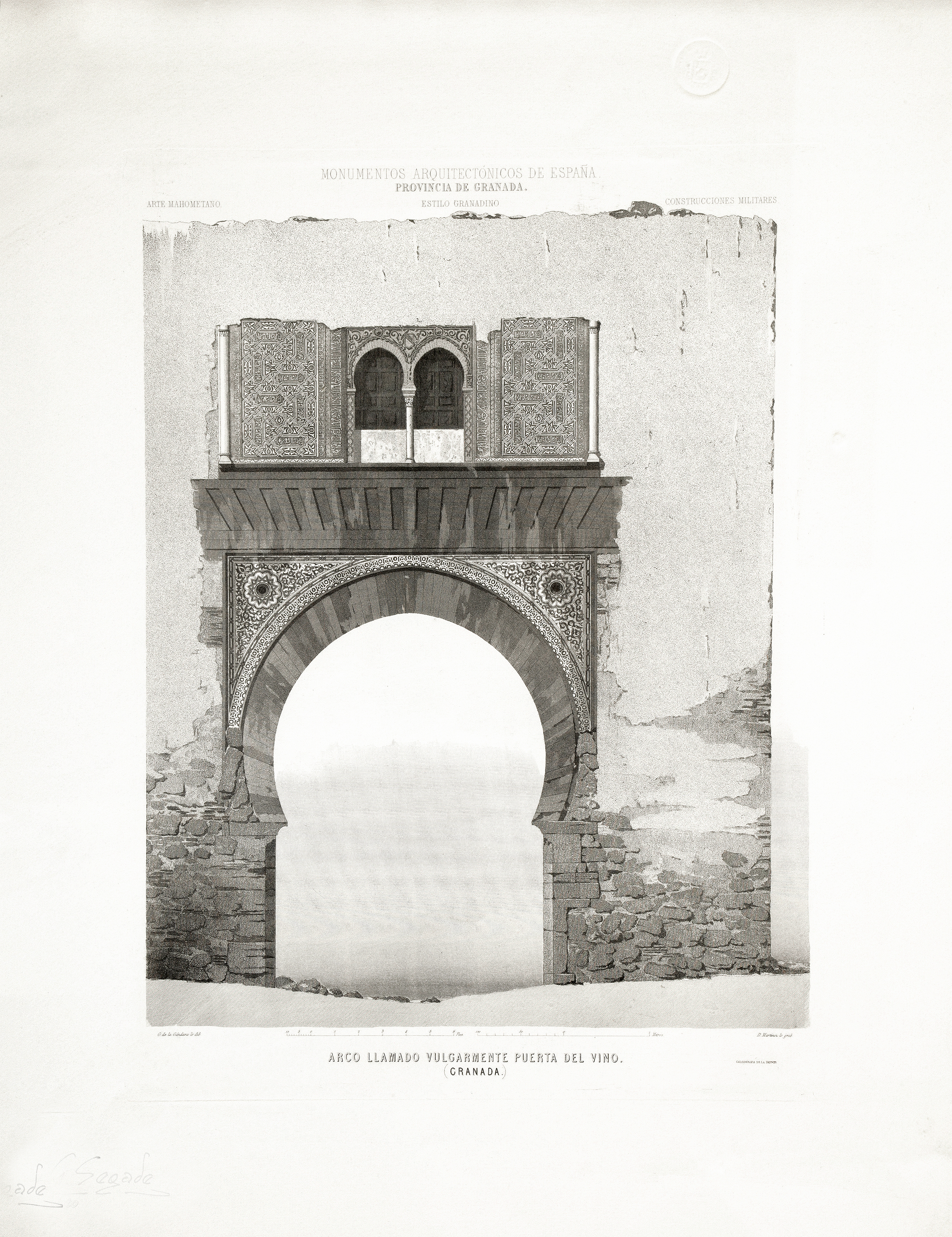 Presenta la inscripción: MONUMENTOS ARQUITECTÓNICOS DE ESPAÑA// PROVINCIA DE GRANADA// ARTE MAHOMETANO/ ESTILO GRANADINO/ CONSTRUCCIONES MILITARES// ARCO LLAMADO VULGARMENTE PUERTA DEL VINO.// (GRANADA.)
