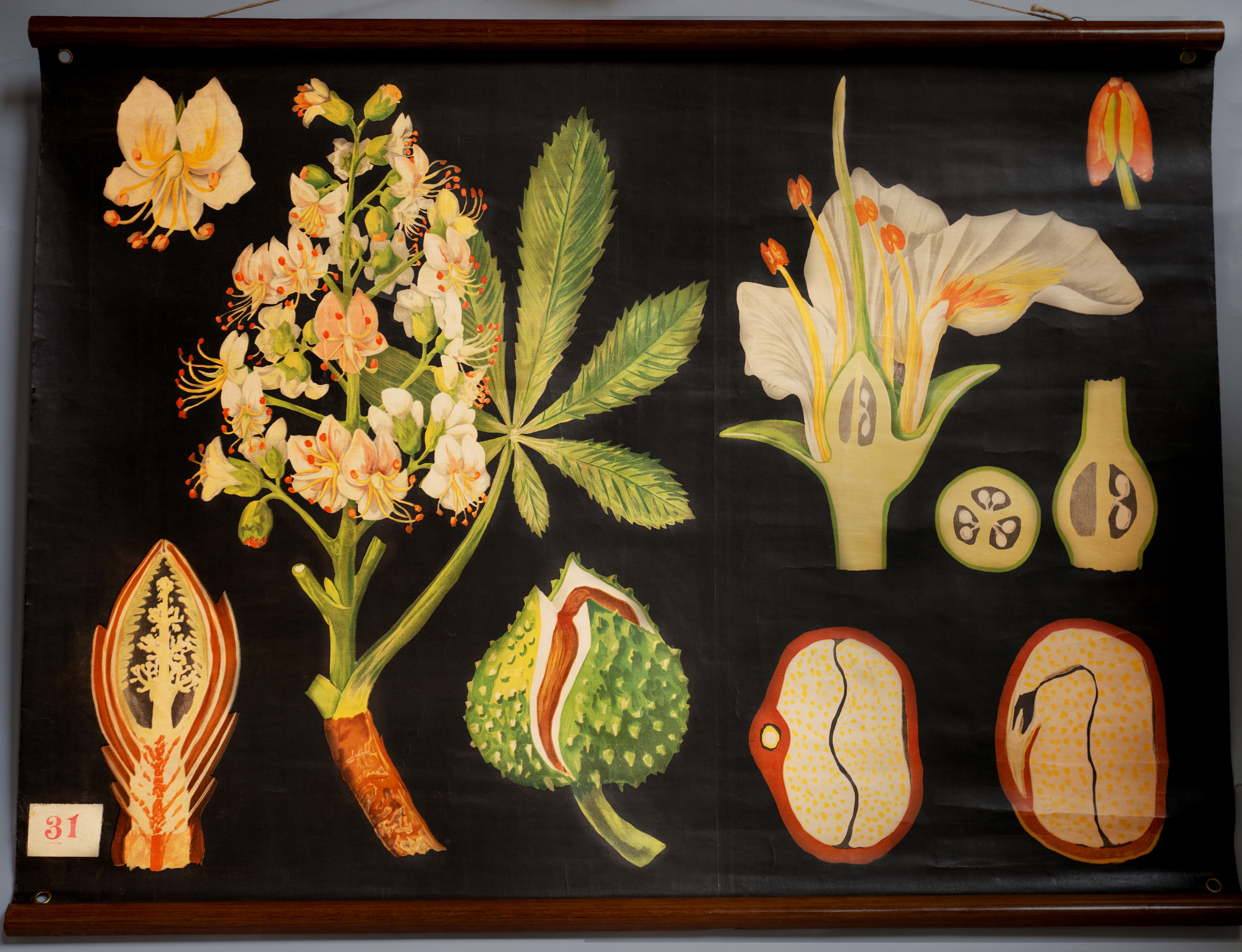 Esta lámina muestra, sobre un fondo negro, distintos aspectos de la anatomía del castaño de indias (Aesculus hippocastanum): el desarrollo de su raíz, su crecimiento, los detalles externos e internos de sus flores y los frutos cuya cápsula equinada envuelve la semilla, etc.