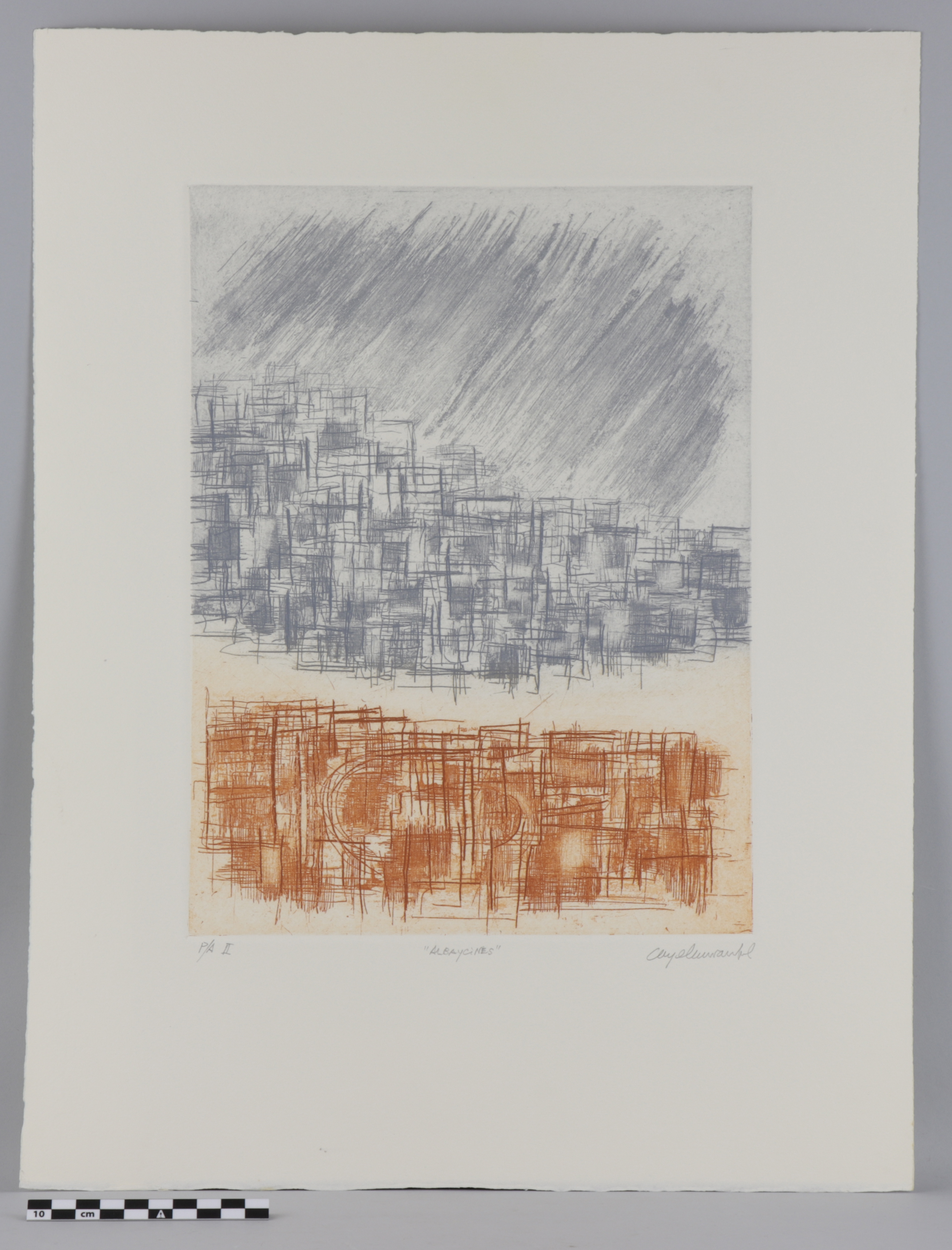 Bajo la huella del grabado en el lado izquierdo se encuentra el número de edición, en el centro el título del grabado y en el lado derecho la firma del autor.