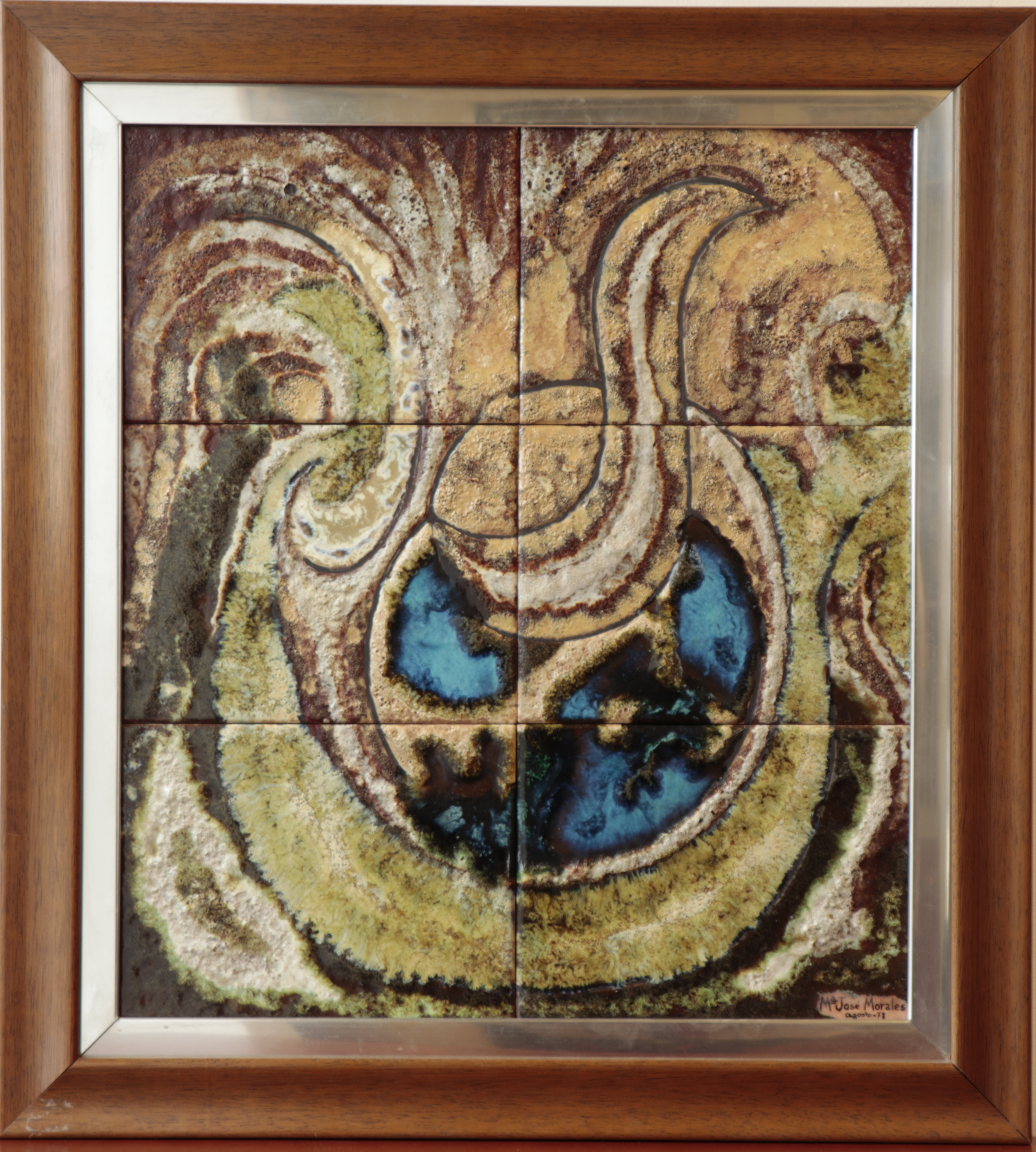 Mediante la conjunción de seis azulejos esmaltados se obtiene un resultado unitario sugerente y lleno de viva expresividad. El juego de curvas y contracurvas se ven reforzadas por la intensa policromía en tonos verdes, ocre y azul, dotando a la obra de gran dinamismo y fuerza.
